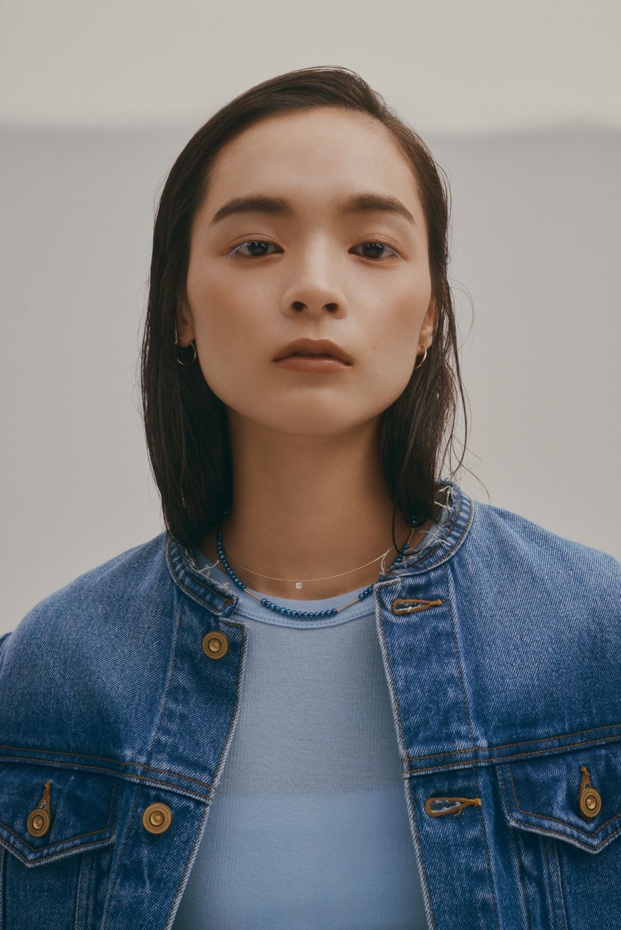「パール=女性っぽくしがちなところを、切りっぱなしデニムのハードな素材を合わせて、相反するテイストで冒険を!クルーネックカットソーに沿うようなネックレスのレイヤードで、首元にも強さを出しています。ALLブルーコーデが様になるのは、インディゴパールだからこそ。