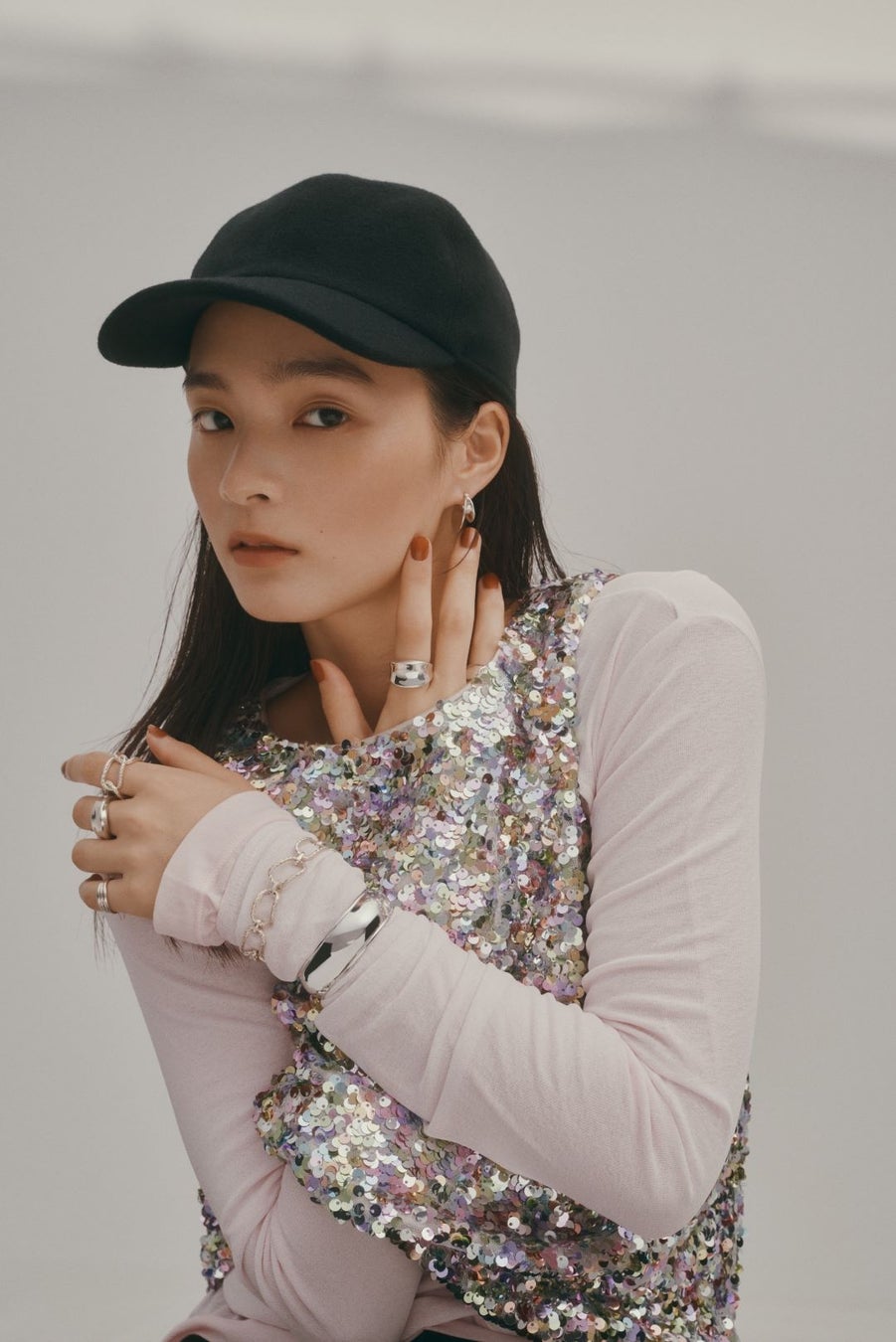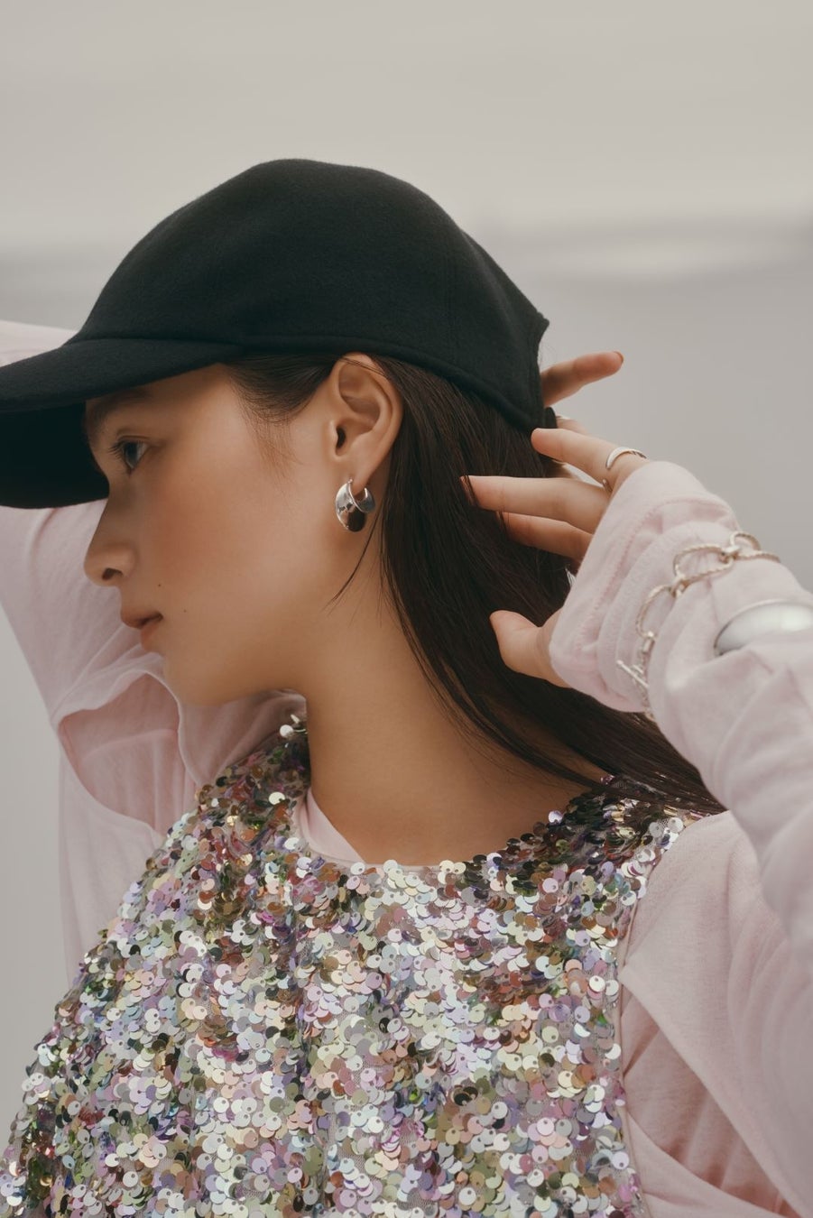 「 “シルバーにはデニム” という固定概念を捨て、シルバーのウェアで輝きの相乗効果を狙いました。スパンコールがキラキラと揺れるやわらかいイメージのシルバーと、重厚感のあるシルバージュエリーのギャップで質感の異なる輝きに。ドレッシーにならないようロンTとキャップを合わせることで、カジュアルな煌めきを提案しています。」(丸山さん)