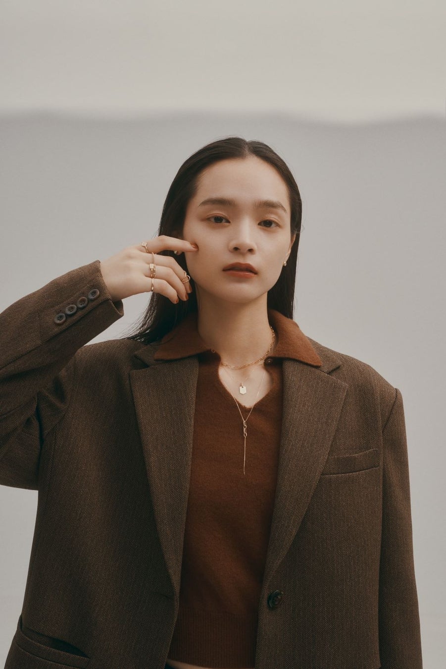 「ブラウンを基調とした、トレンドを意識したマニッシュなスタイリング。ジュエリーはダイヤモンドでまとめ、チェーンネックレスをアクセントに重ねました。チェーンのハードさに合わせてジャケットで強いアイテムをプラスしました。華奢なネックレスは肌にのせたほうが引き立つため、ニットのネックボタンを外して。手元に繊細なダイヤモンドリングをたくさん重ね、最後にミディリングをセットしています。」(丸山さん)
