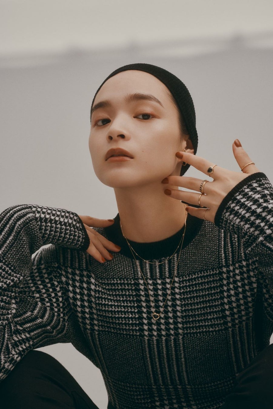 「ジュエリーはハートのオニキスを主役にした、可愛い要素というよりは大人っぽい見え方になるよう、華奢なゴールドジュエリーと合わせてモダンな大人っぽさを意識したスタイリングにしています。オニキスのフルエタニティーリングとニットのグレンチェック柄が、リンクして可愛いです。」(丸山さん)