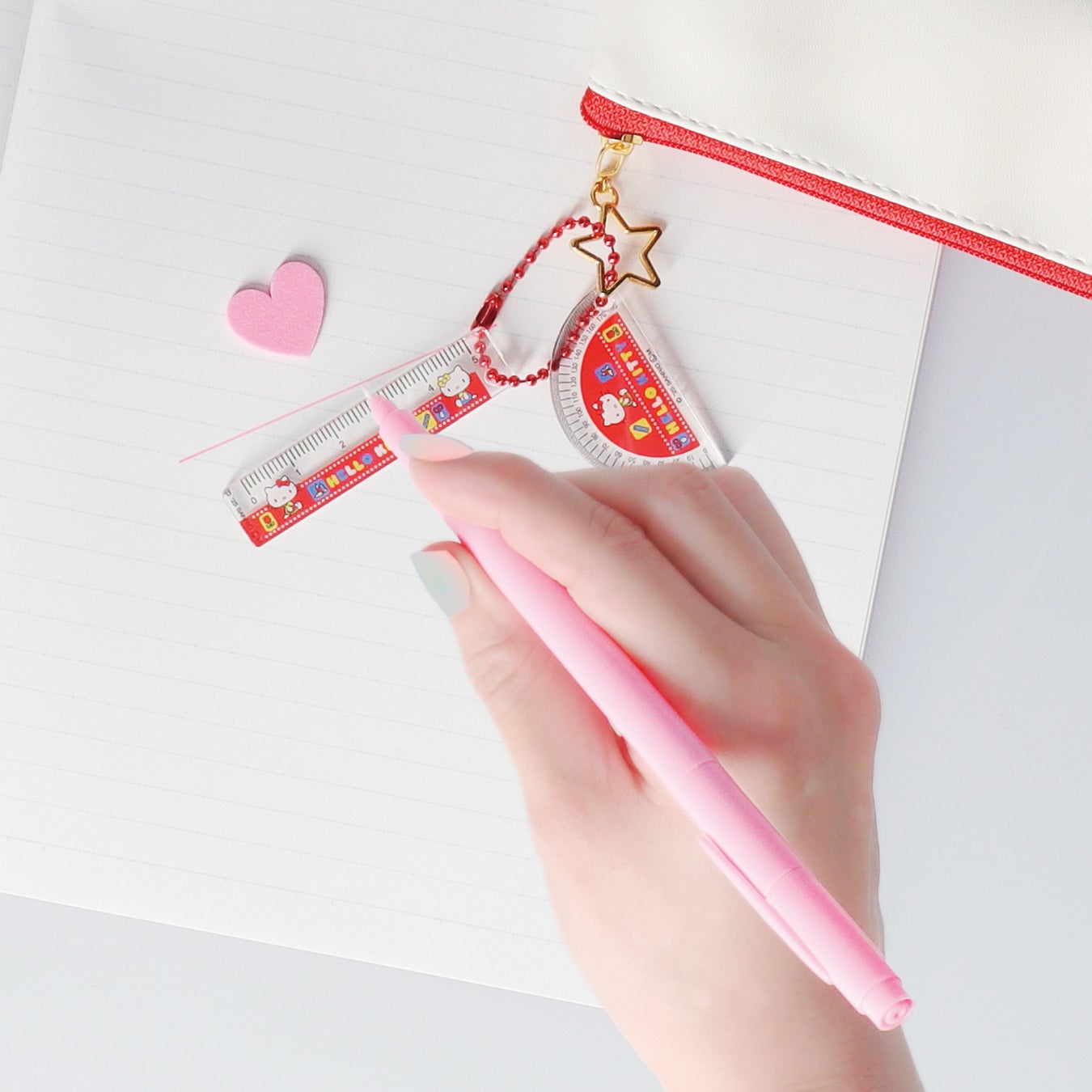 筆箱の中身の定番アイテム、サンリオキャラクターズの分度器と定規がキーホルダーになって登場します。ハローキティやバッドばつ丸、おさるのもんきちなど、コレクション心をくすぐる全10種がラインアップ。
