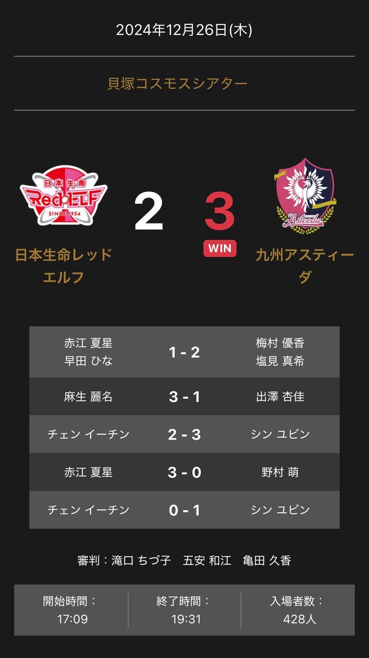 ノジマTリーグ 2024-2025シーズン 公式戦 12月26日開催 「日本生命レッドエルフ vs 九州アスティーダ」の試合は、3-2で九州アスティーダが勝利しました。