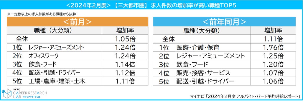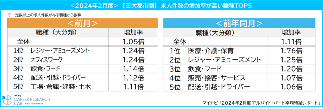 職種(大分類)別では、[飲食・フード]が1,147円(前月比:5円増、前年同月比:46円増)で、23年2月以降は1,100円以上で推移し、直近は8カ月連続で過去最高額を更新。また、求人件数は前月比で1.14倍に増加、前年同月比で1.20倍に増加している。