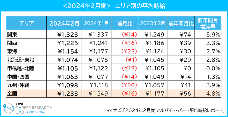 「関東」は1,323円で前月比は14円の減少、前年同月比は74円の増加(増減率:+5.9%)で、前年同月比は全7エリアで最も増加した。また、23年10月の最低賃金改定以降5カ月連続1,300円以上で推移している。