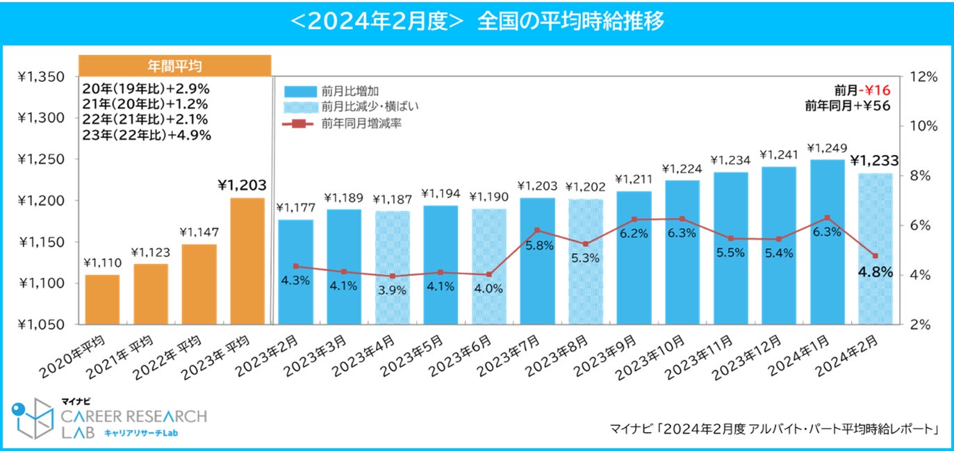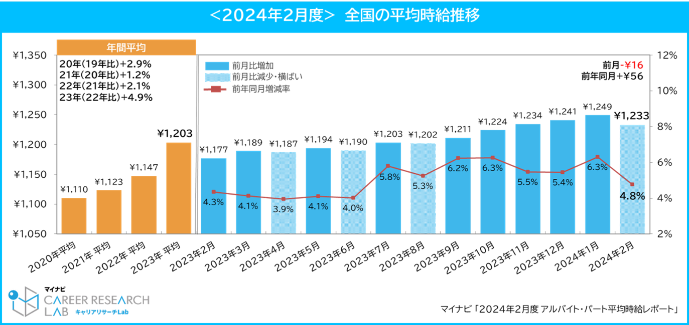 24年2月の全国平均時給は1,233円で前月比は減少