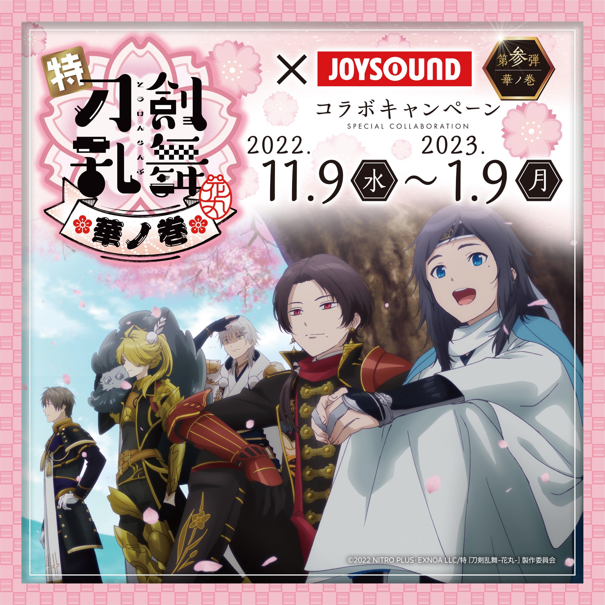 株式会社エクシングの子会社で、全国にカラオケ店舗を展開する株式会社スタンダード(本社:東京都港区、代表取締役社長:米田洋一)は、2022年11月9日(水)から2023年1月9日(月)までの期間中、「特『刀剣乱舞-花丸-』〜雪月華〜」×JOYSOUND直営店コラボキャンペーン第参弾と題して、JOYSOUND仙台一番町店(宮城)・JOYSOUND名駅二丁目店(愛知)・JOYSOUNDなんば戎橋店(大阪)・JOYSOUND博多口駅前店(福岡)にカラオケコラボルームをオープンいたします。また、コラボルーム実施店舗を含む、全国のJOYSOUND直営店25店舗にて、「特『刀剣乱舞-花丸-』〜雪月華〜」オリジナルコースター付きコラボドリンクメニューを展開します。