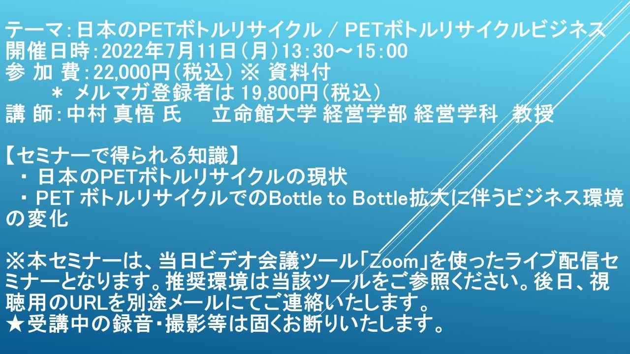 先端技術情報や市場情報を提供している(株)シーエムシー・リサーチ(千代田区神田錦町: https://cmcre.com/ )では、 各種材料・化学品などの市場動向・技術動向のセミナーや書籍発行を行っておりますが、 このたび「日本のPETボトルリサイクル / PETボトルリサイクルビジネス」と題するセミナーを、 講師に中村 真悟 氏 立命館大学 経営学部 経営学科 教授)をお迎えし、2022年7月11日(月)13:30より、 ZOOMを利用したライブ配信で開催いたします。 受講料は、 一般:22,000円(税込)、 弊社メルマガ会員:19,800円(税込)となっております(資料付)。