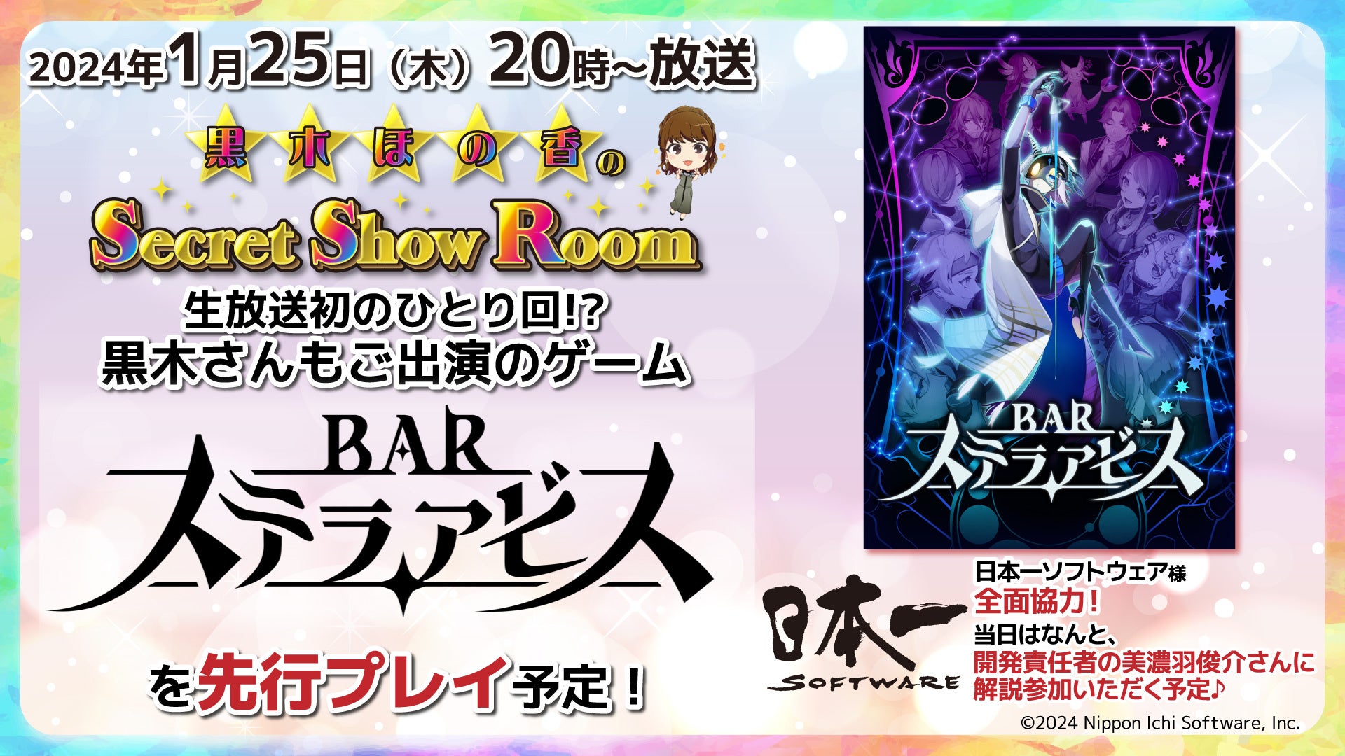 1月25日(木)20時~の第84回は、初のひとり生放送。日本一ソフトウェア様全面協力のもと、黒木さんもご出演の新作ゲーム「BARステラアビス」を先行プレイ予定。