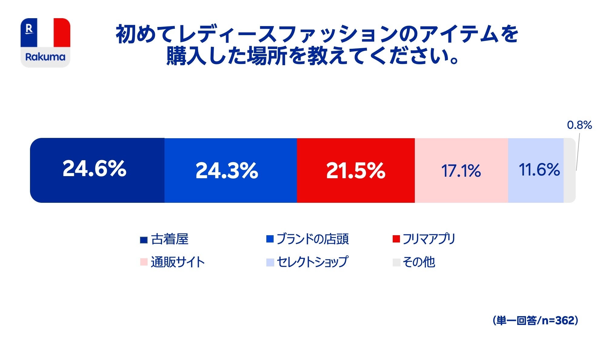 「初めて『レディースファッション』のアイテムを購入した場所」(単一回答)について質問したところ、「古着屋」(24.6%)が最多となりました。次いで「ブランドの店頭」(24.3%)、「フリマアプリ」(21.5%)、「通販サイト」(17.1%)、「セレクトショップ」(11.6%)という結果でした。