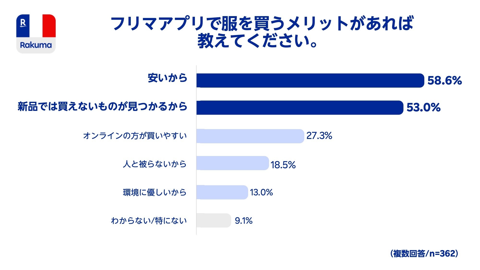 「フリマアプリで服を買うメリット」(複数回答)について質問したところ、最も多かったのは「安いから」(58.6%)、次いで「新品では買えないものが見つかるから」(53.0%)、「オンラインの方が買いやすい」(27.3%)、「人と被らないから」(18.5%)、「環境に優しいから」(13.0%)、「わからない/特にない」(9.1%)という結果になりました。