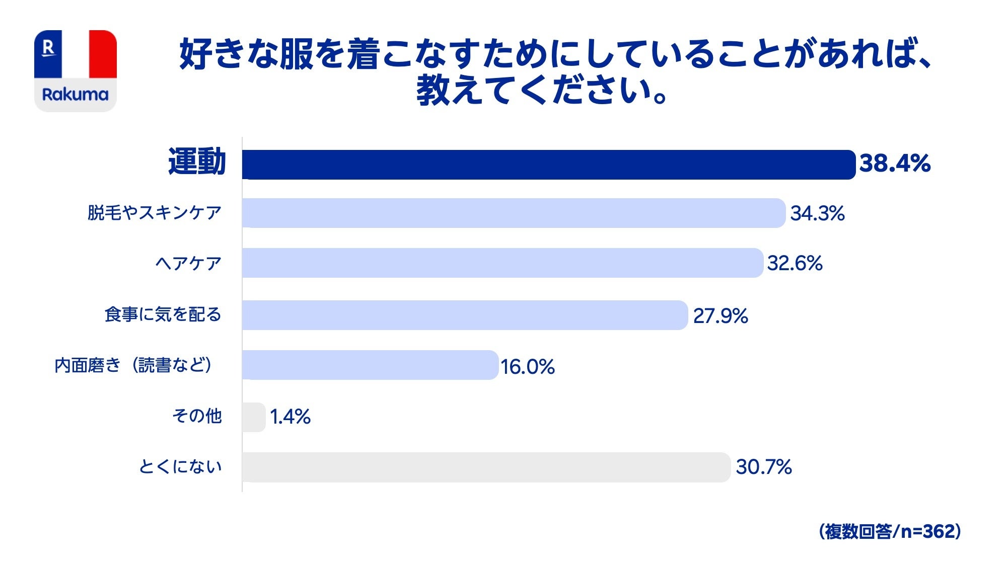 「好きな服を着こなすためにしていること」(複数回答)について質問したところ、全回答者の68.0%が何らかの自分磨きをしていると回答しました。最も多かったのは「運動」(38.4%)、次いで「脱毛やスキンケア」(34.3%)、「ヘアケア」(32.6%)、「食事に気を配る」(27.9%)、「内面磨き(読書など)」(16.0%)という結果となりました。