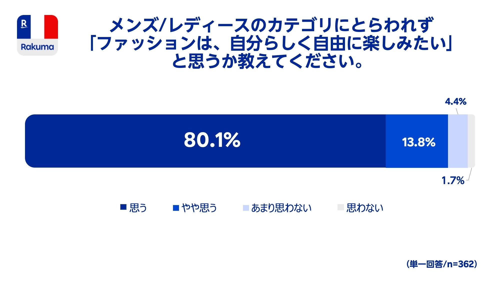 「メンズ/レディースのカテゴリにとらわれず『ファッションは、自分らしく自由に楽しみたい』と思うか」(単一回答)について質問したところ、合計93.9%が「思う」(80.1%)、「やや思う」(13.8%)と答えました。