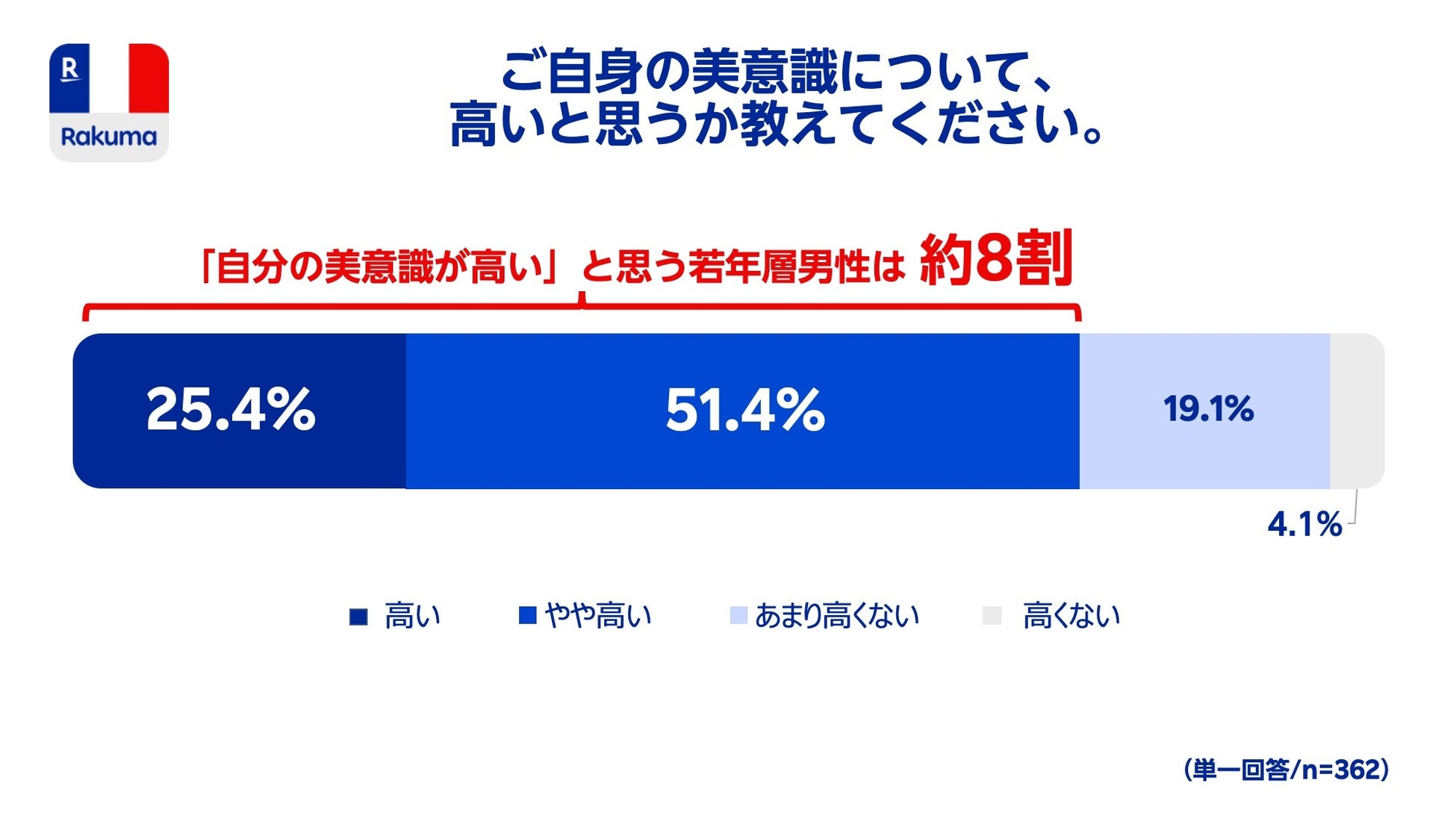 「ご自身の美意識について、高いと思うか」(単一回答)について質問したところ、合計76.8%が「高い」(25.4%)、「やや高い」(51.4%)と答え、「レディースファッション」アイテムを購入する10代・20代男性の多くは美意識が高いことがわかりました。
