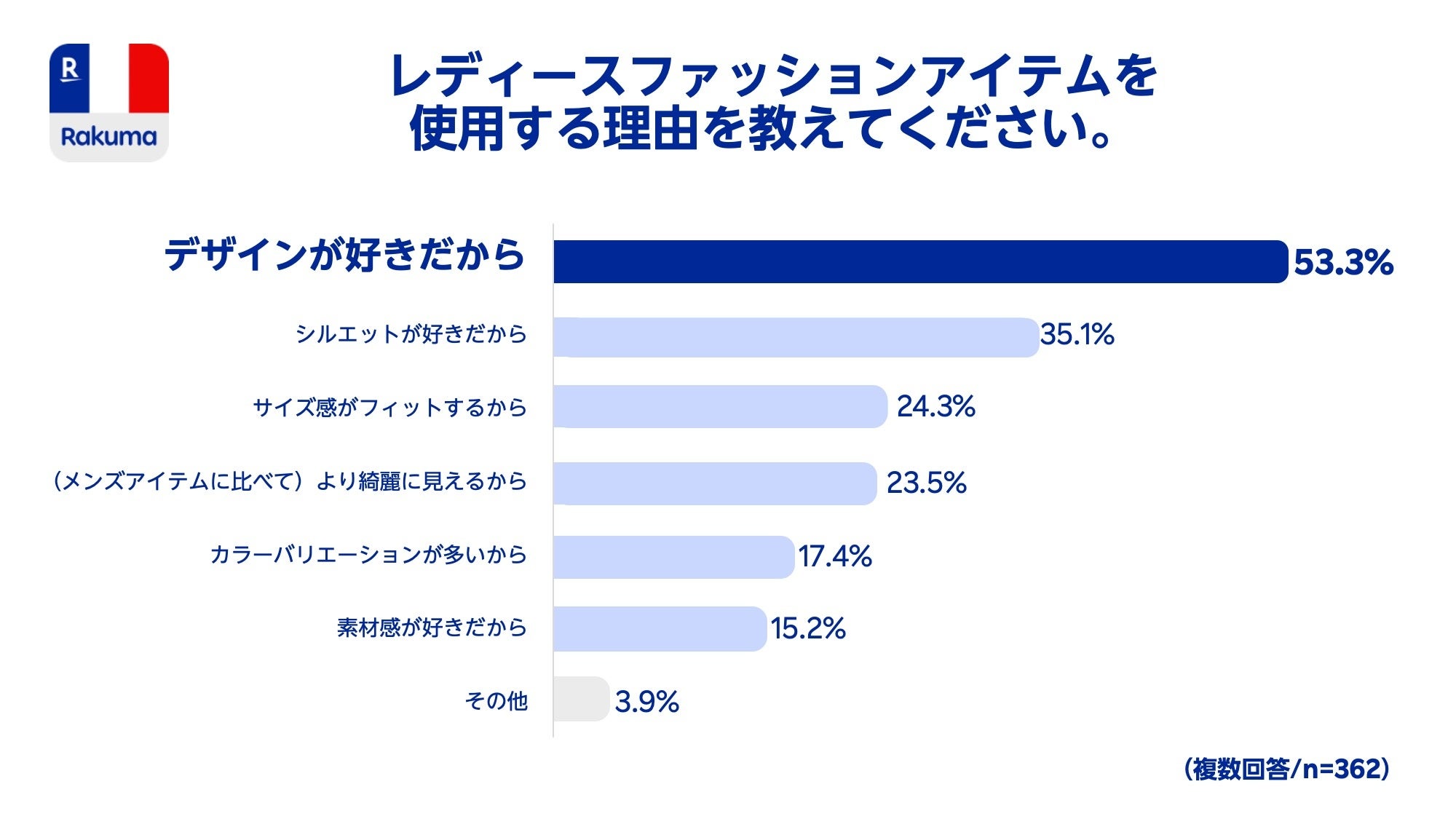 「『レディースファッション』アイテムを使用する理由」(複数回答)について質問したところ、「デザインが好きだから」(53.3%)が最も多く、次いで「シルエットが好きだから」(35.1%)、「サイズ感がフィットするから」(24.3%)、「(メンズアイテムに比べて)より綺麗に見えるから」(23.5%)、「カラーバリエーションが多いから」(17.4%)、「素材感が好きだから」(15.2%)、という結果で、メンズアイテムにはあまり見られないデザインやシルエット、カラーに魅力を感じている人が多いことがわかりました。