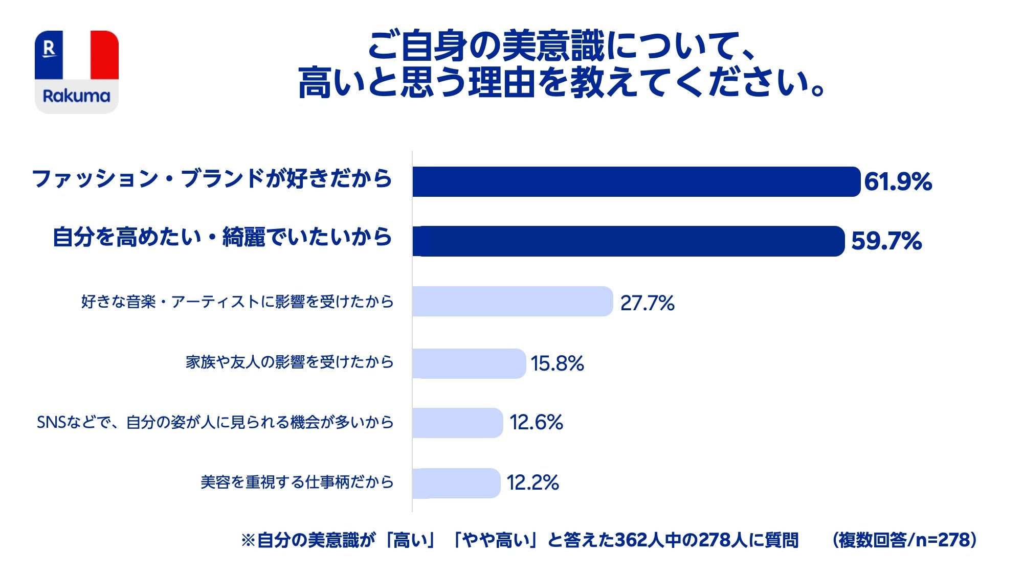 自分の美意識が「高い」、「やや高い」と答えた278人に「その理由」について質問したところ、「ファッション・ブランドが好きだから」(61.9%)が最多、次いで「自分を高めたい、綺麗でいたいから」(59.7%)、「好きな音楽・アーティストに影響を受けたから」(27.7%)、「家族や友人の影響を受けたから」(15.8%)、「SNSなどで、自分の姿が人に見られる機会が多いから」(12.6%)、「美容を重視する仕事柄だから」(12.2%)という結果でした。