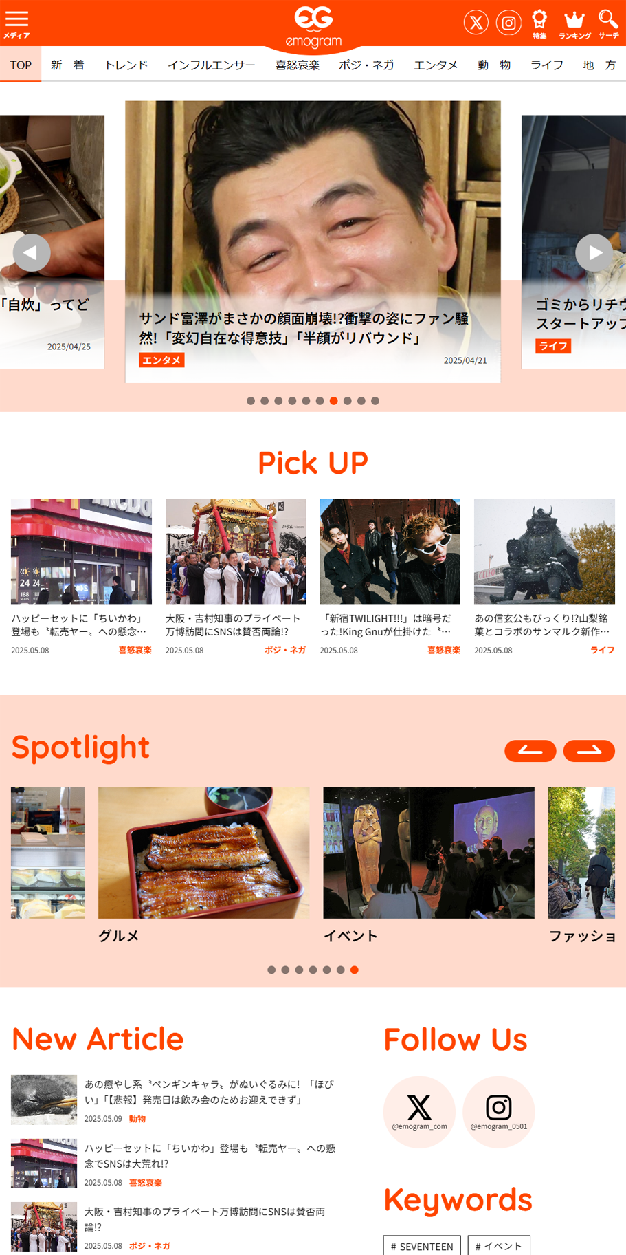 エモグラムでは、エンターテインメントやインフルエンサー、動物、グルメ、美容・コスメティック、ファッション、マネー、育児・子育てなど多様なジャンルの最新情報を〝ポジティブ〟な視点で紹介します。