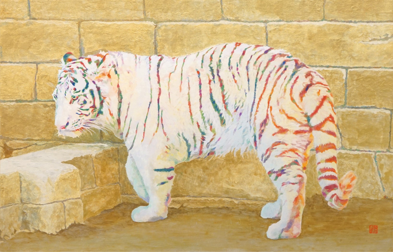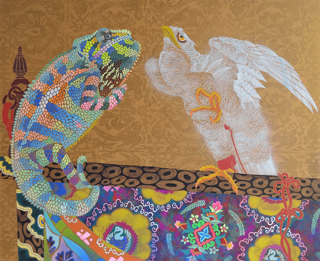 日本画の確かな技術を活かし、色鮮やかなカメレオンの点描画を描きます。身体の隅から隅まで点で覆われているカメレオンは、まるで今にも画面から飛び出してくるような生命力に溢れています。この独特な世界感は、国内のみならず海外でも高い人気を博しています。