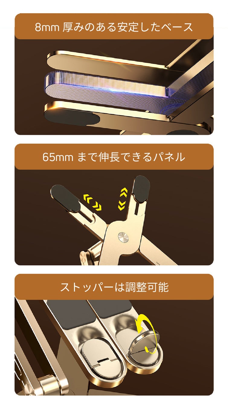 シリコン製ストッパーは調整可能で、65mmまで伸長できるパネルにより、機器のサイズにぴったり合わせることができます。