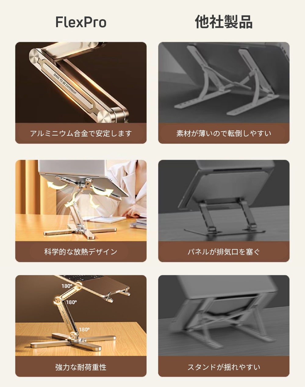 耐荷重10kgの頑丈なアルミ合金製のFlexProは、高級感も抜群でワークスペースを引き立てます。