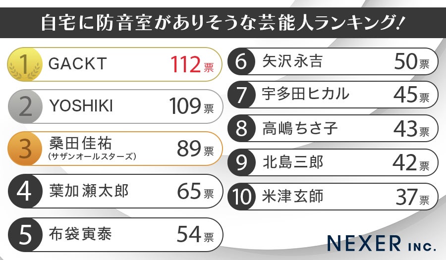 今回のアンケートでは、多くの人が「音楽へのこだわり」や「自宅でも演奏・制作していそう」といった視点から、自宅に防音室を備えていそうな芸能人を連想していることがわかりました。