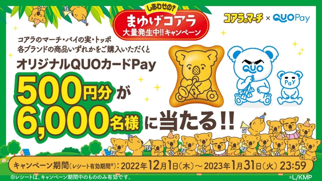 オリジナルQUOカードPay500円分が6,000名様に当たる!『コアラのマーチ×QUOカードPayしあわせの?まゆげコアラ大量発生中!!キャンペーン』2022年12月1日(木)開始!