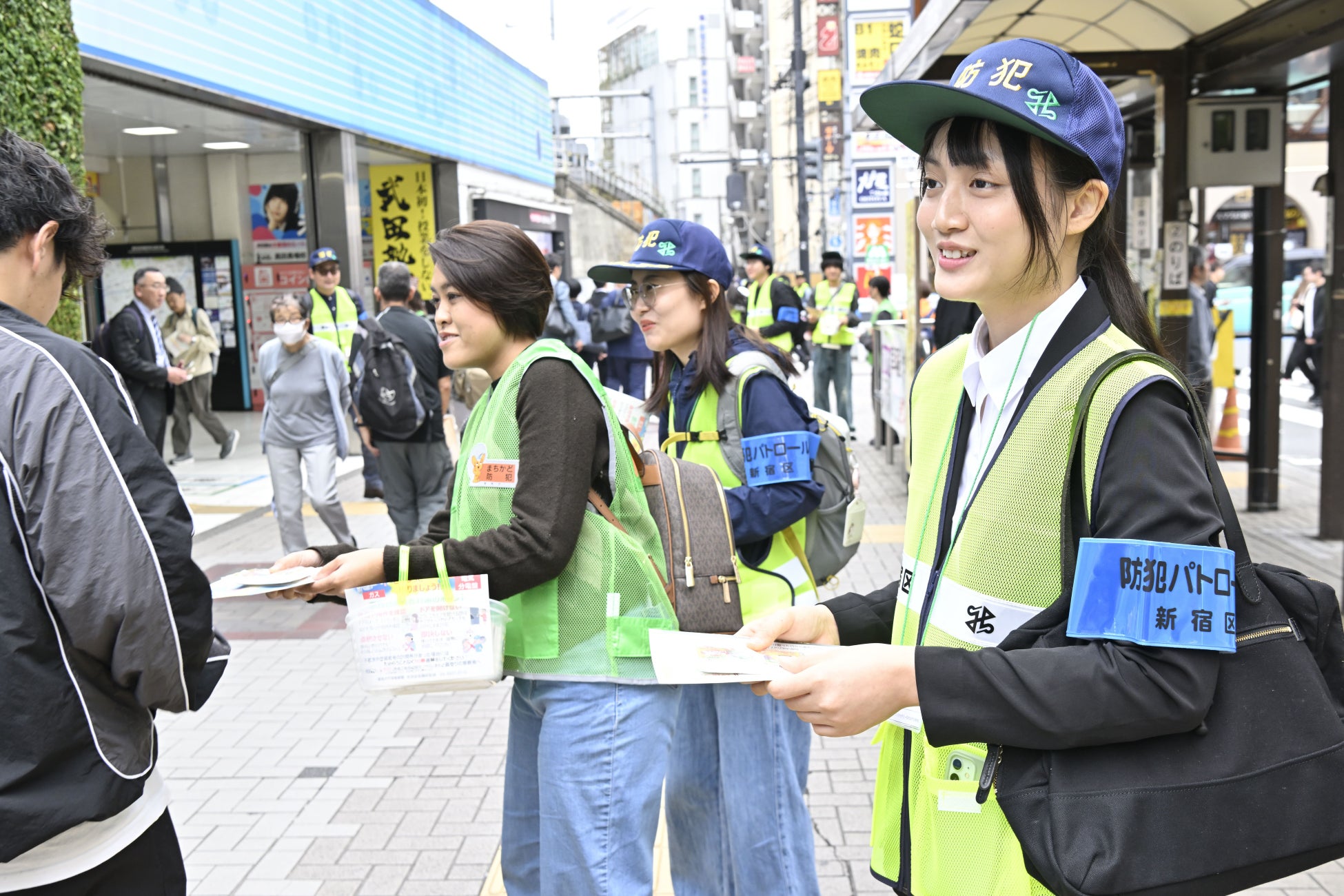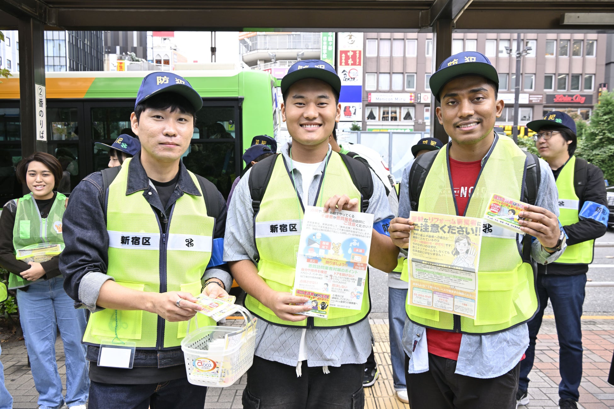 結成式終了後には、高田馬場駅前で防犯キャンペーンのためのチラシ・ポケットティッシュ配布を当校の外国籍学生26名と地域のボランティア団体が共同で行い、地域の方々と交流をしながら防犯への注意喚起を行いました。