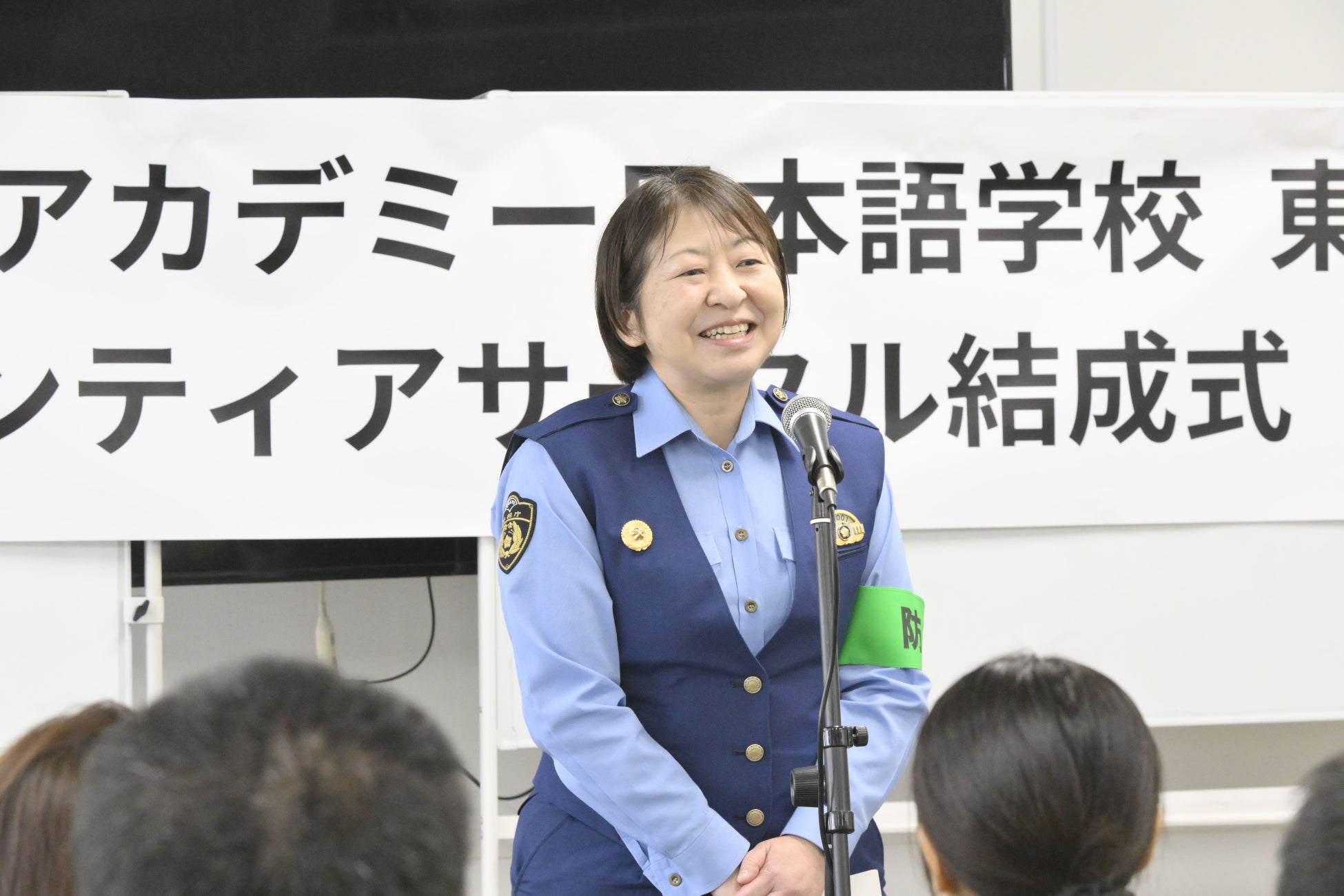 当日は当校の外国籍学生26名が参加し、戸塚警察署の長谷川署長、新宿区危機管理課の宮野氏らが出席。防犯ボランティア団体モデル校指定証およびボランティアグッズの授与が行われました。