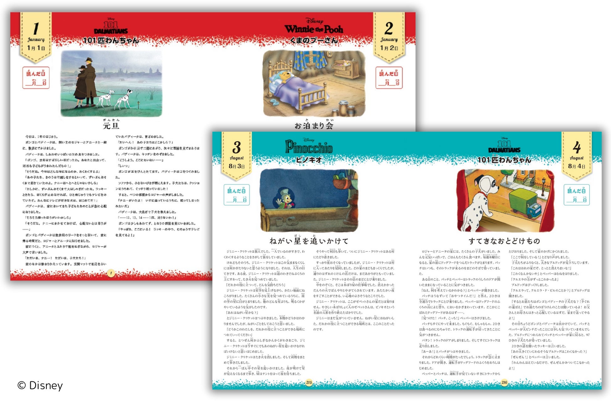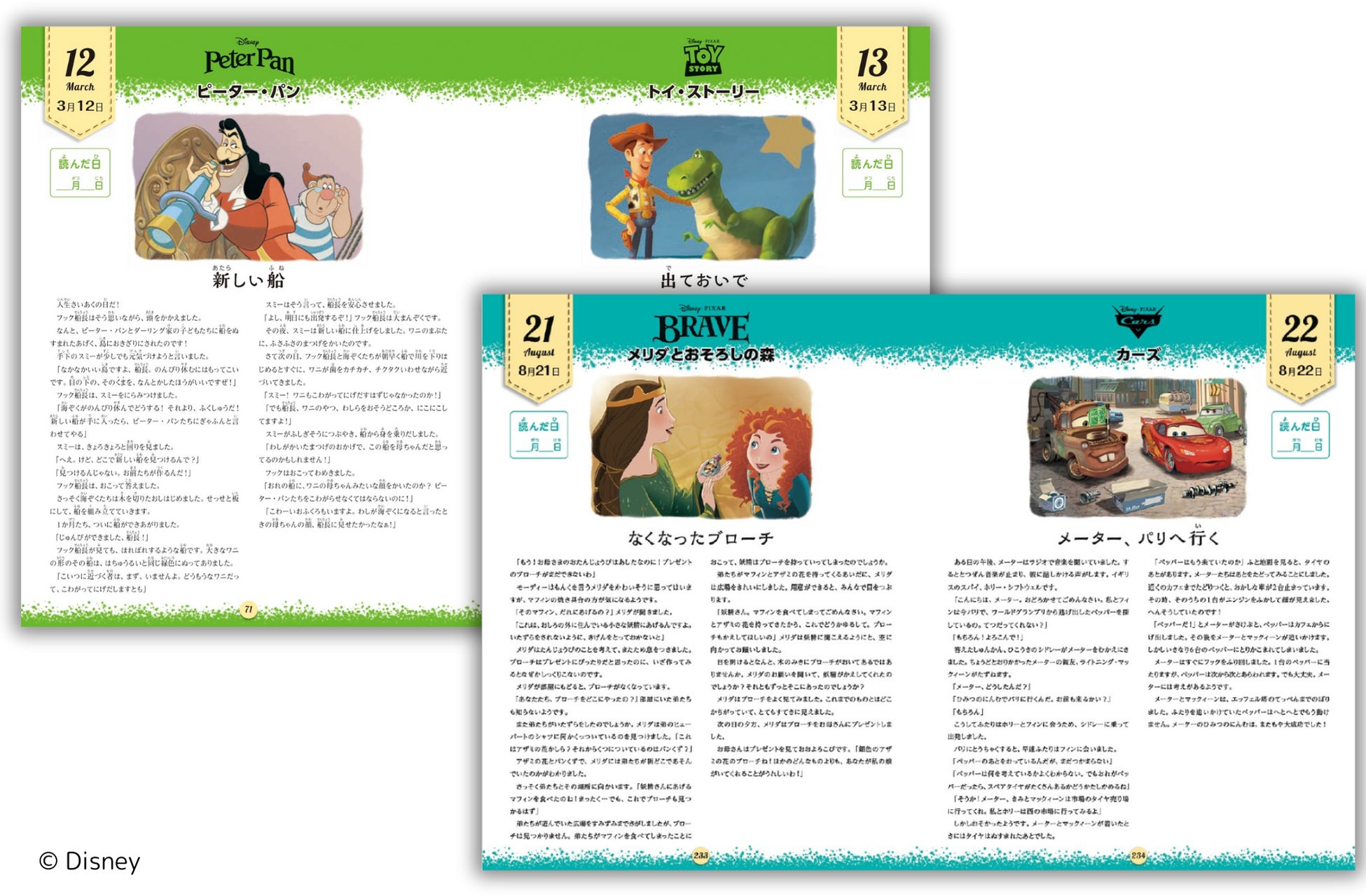 本書は、ディズニーの54作品から1年365日分のショートストーリーを1冊にまとめた物語集です。最多掲載数の『くまのプーさん』を始め、『トイ・ストーリー』、『アラジン』、『101匹わんちゃん』など、ディズニーの歴史を彩るそうそうたる作品が、1年間通じて楽しめます。普遍的なストーリーを繰り返し読むことで、感性豊かなお子さんに育つお手伝いをします。