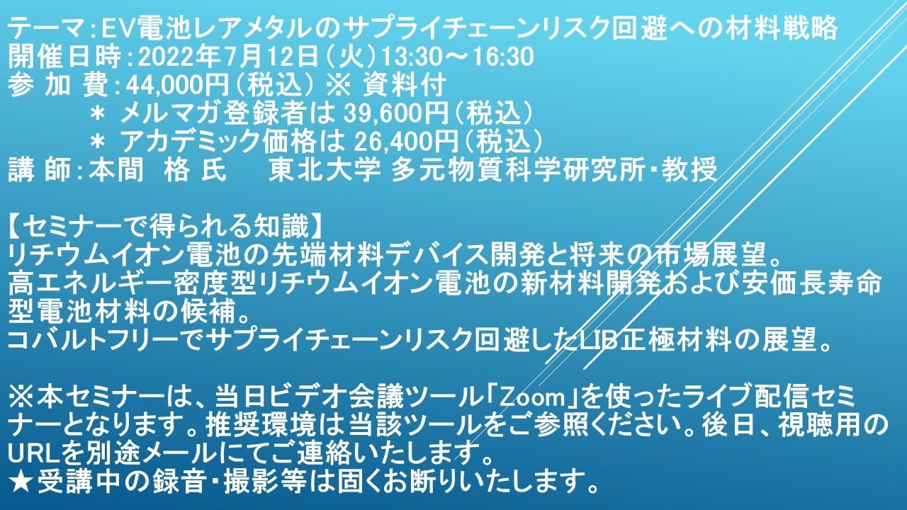 先端技術情報や市場情報を提供している(株)シーエムシー・リサーチ(千代田区神田錦町: https://cmcre.com/ )では、 各種材料・化学品などの市場動向・技術動向のセミナーや書籍発行を行っておりますが、 このたび「EV電池レアメタルのサプライチェーンリスク回避への材料戦略」と題するセミナーを、 講師に本間 格 氏 東北大学 多元物質科学研究所・教授)をお迎えし、2022年7月12日(火)13:30より、 ZOOMを利用したライブ配信で開催いたします。 受講料は、 一般:44,000円(税込)、 弊社メルマガ会員:39,600円(税込)、 アカデミック価格は26,400円(税込)となっております(資料付)。