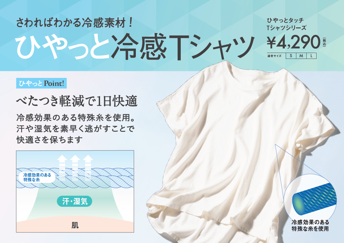 今シーズンは、年々厳しさを増す日本の夏の暑さに着目し、着ている方が涼しく心地よい猛暑対策アイテム<ひやっとタッチTシャツシリーズ>をリリース。冷感効果のある特殊な糸を採用し、肌触りがひんやり心地良い「接触冷感機能」が備わった大人の為の機能性Tシャツです。大人女性を素敵に魅せるシルエット・素材感に徹底的にこだわっていることも魅力です。