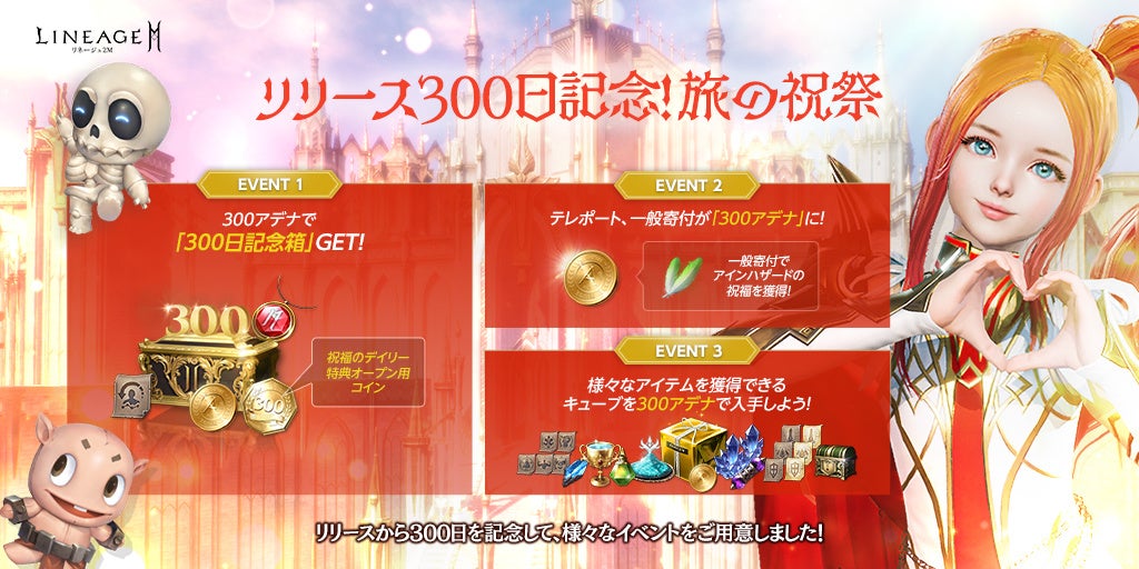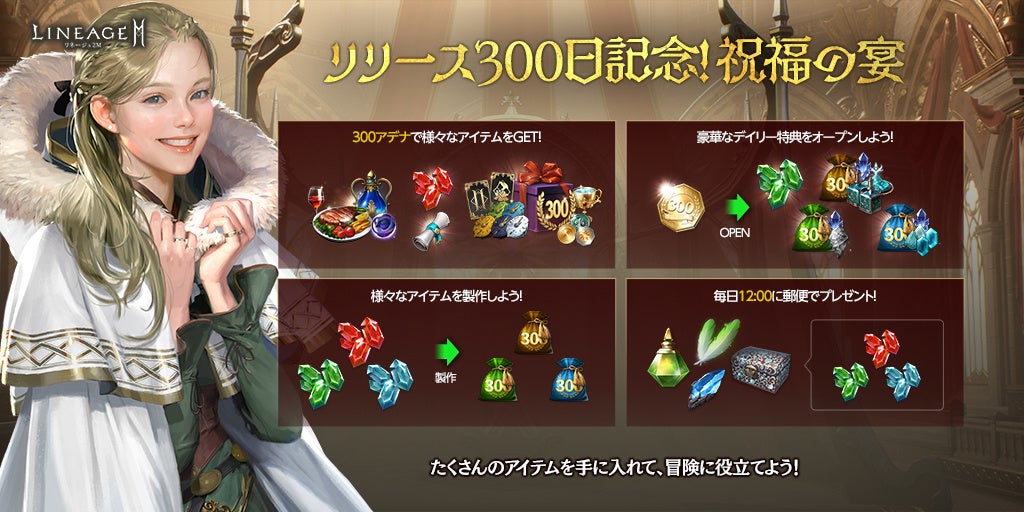 期間中300アデナを使用して「300日記念箱(イベント)」を獲得することができます。「300日記念箱(イベント)」はダイヤ ショップの交換所にて、レベル30以上のキャラクターにて1アカウントにつき1回の獲得が可能です。