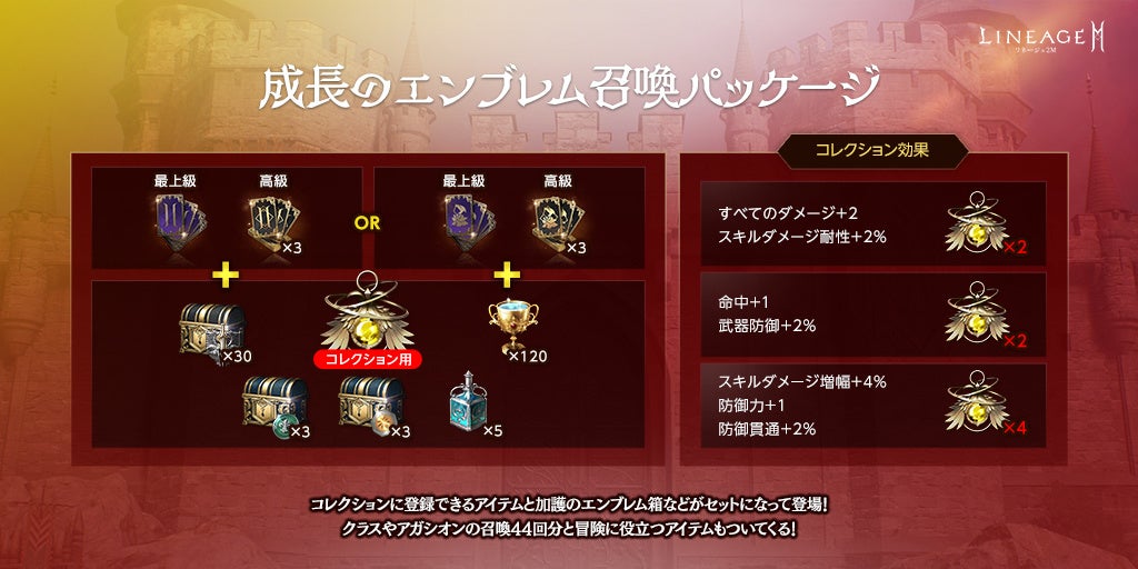 永続的に効果が発生する専用コレクションに登録できるアイテムと、加護のエンブレム箱にクラスやアガシオンの召喚44回分などがセットになったパッケージが登場しました。