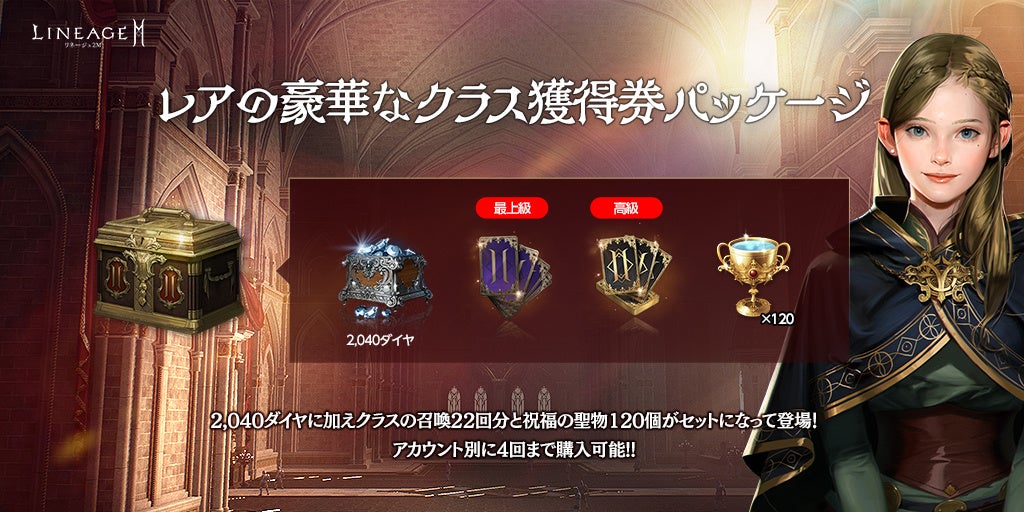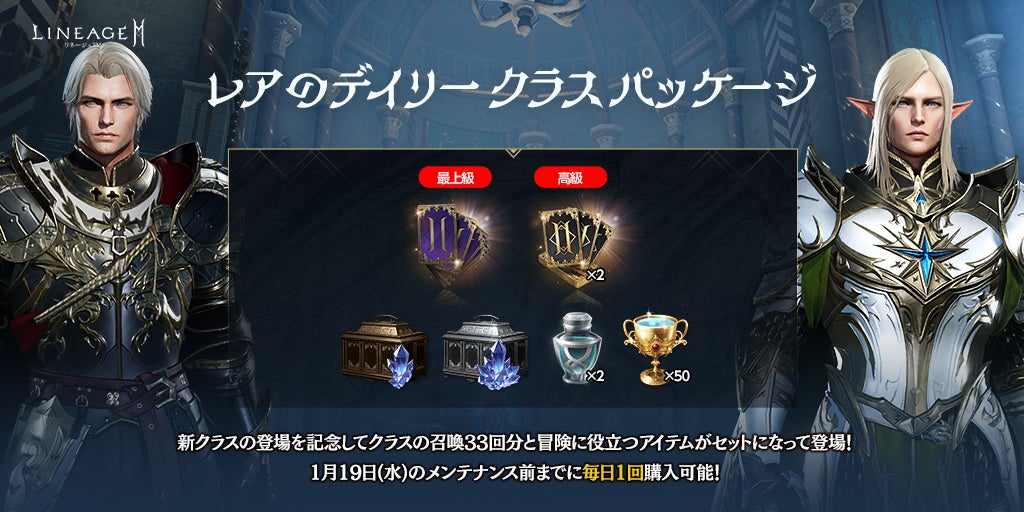 新クラスの登場を記念して、毎日1回、500ダイヤで購入できる、「加護の最上級クラス獲得券II(11回)(刻印)」1個、「加護の高級クラス獲得券II(11回)(刻印)」2個のほか、「祝福の聖物」50個、「ピュアエリクサー(刻印)」2個などがセットとなったお得なパッケージが登場しました。