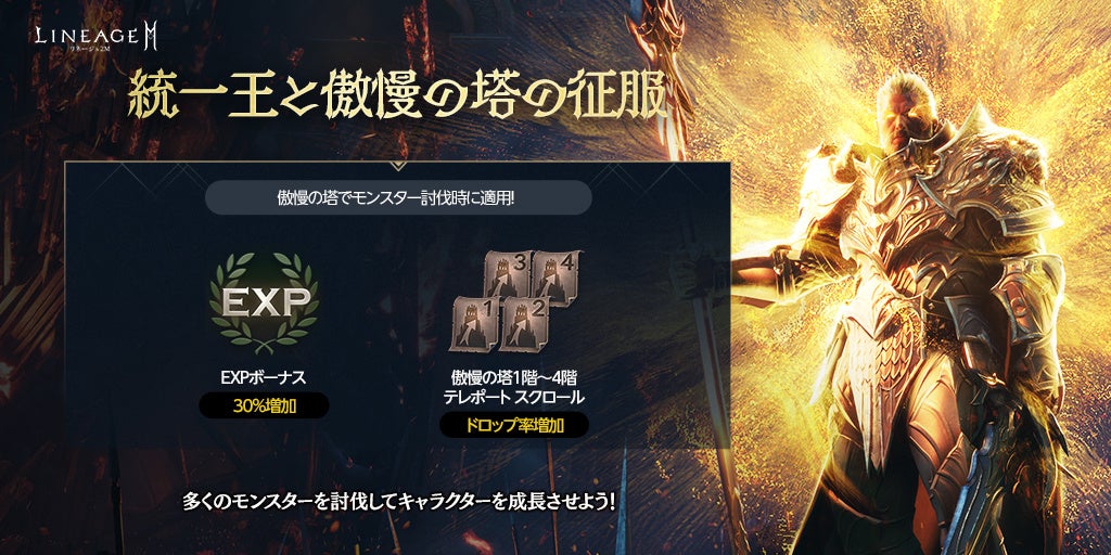 本アップデートでワールド ダンジョン「傲慢の塔」4階を実装しました。これを記念し、「統一王と傲慢の塔の征服」を開催します。期間中、ワールド ダンジョン「傲慢の塔」1階から4階のモンスターを討伐すると、通常時よりも獲得できるEXPが30%増加します。また、各階へのテレポート スクロールのドロップ率が増加します。