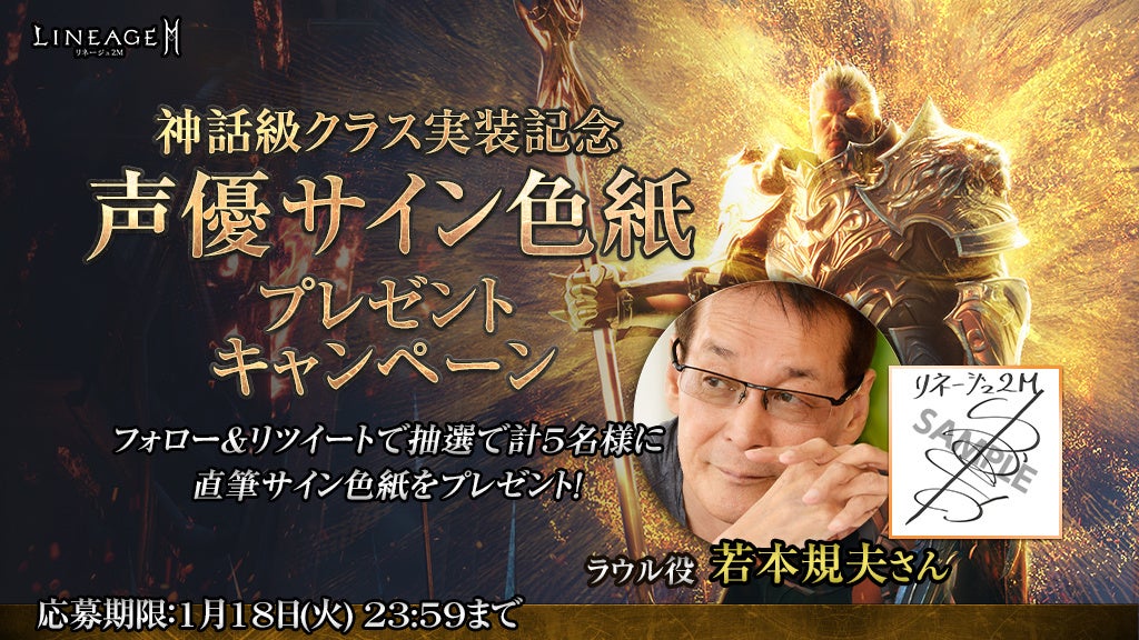 神話級クラス実装を記念して、「ラウル」のCVを担当した若本規夫さんの直筆サイン色紙を抽選で5名様に、リネージュ2M推奨PCと周辺機器のセットを抽選で1名様にプレゼントします。