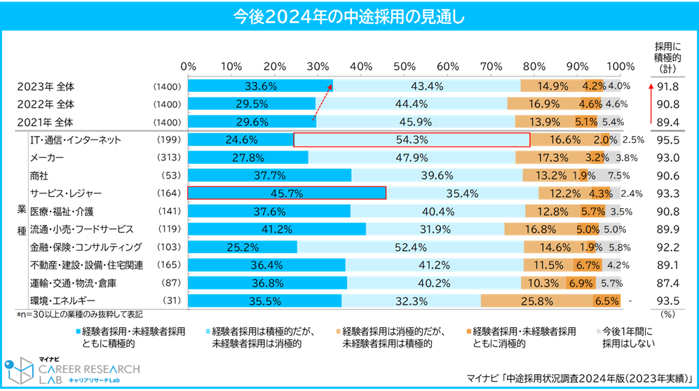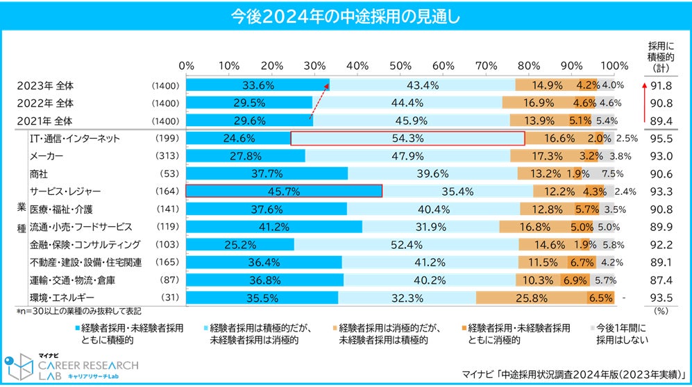 ■24年の中途採用に積極的な企業は91.8%(前年比1.0pt増)。業種別では「IT・通信・インターネット」が95.5%で最多に