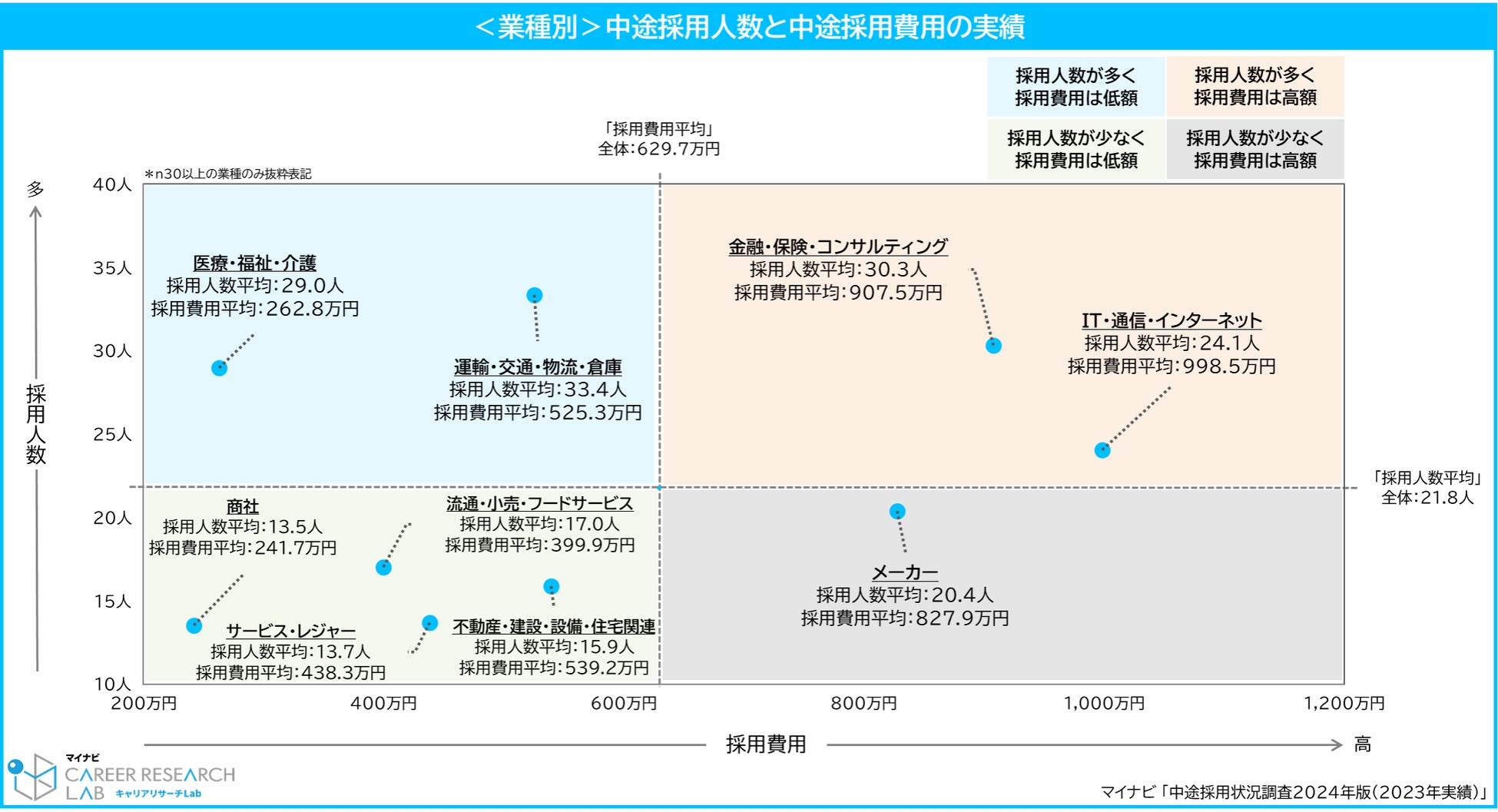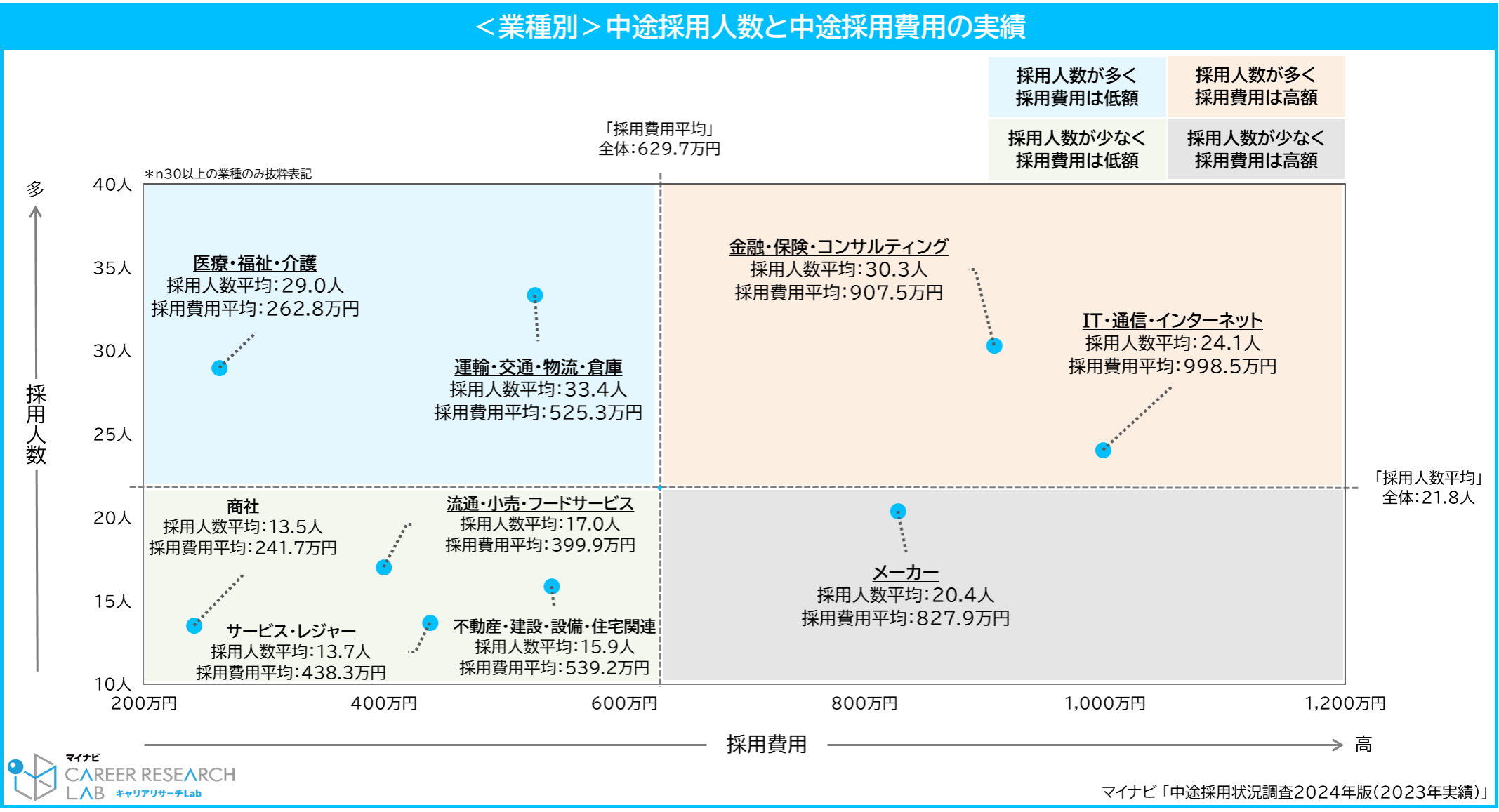 また、23年に採用した人数と採用費用をみると、採用人数が多く、採用費用が低い業種は、「医療・福祉・介護」。一方で採用人数が多く、採用費用が高いのは「IT・通信・インターネット」となった。中途採用費用が増加傾向にある中、業種別の費用感や採用人数には業種間のギャップがある。【図2、3】