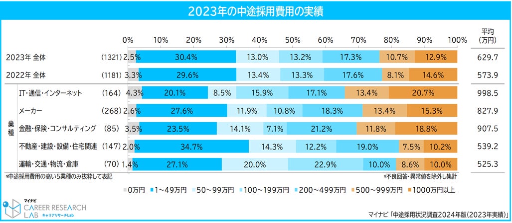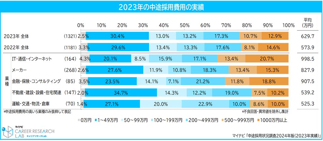 ■23年の中途採用費用は前年比55.8万円増の629.7万円。IT・通信・インターネットでは1,000万円に迫る