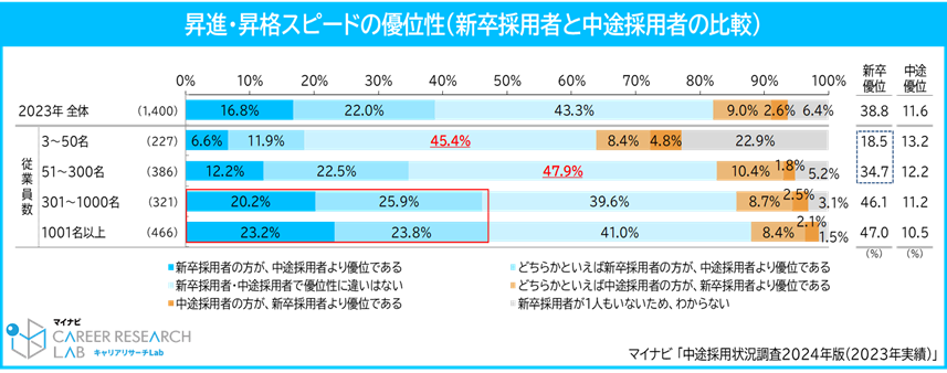 ■昇進・昇格のスピード、38.8%が「新卒優位」、11.6%「中途優位」と回答
