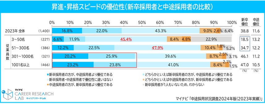 昇進・昇格のスピード、38.8%が「新卒優位」、11.6%「中途優位」と回答【図5、6】