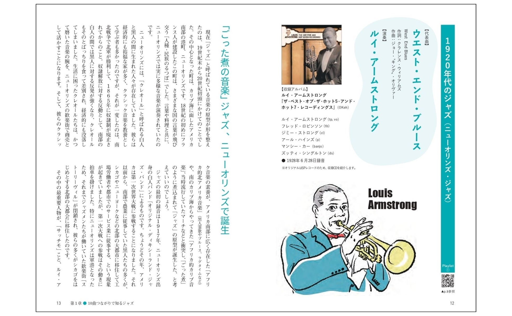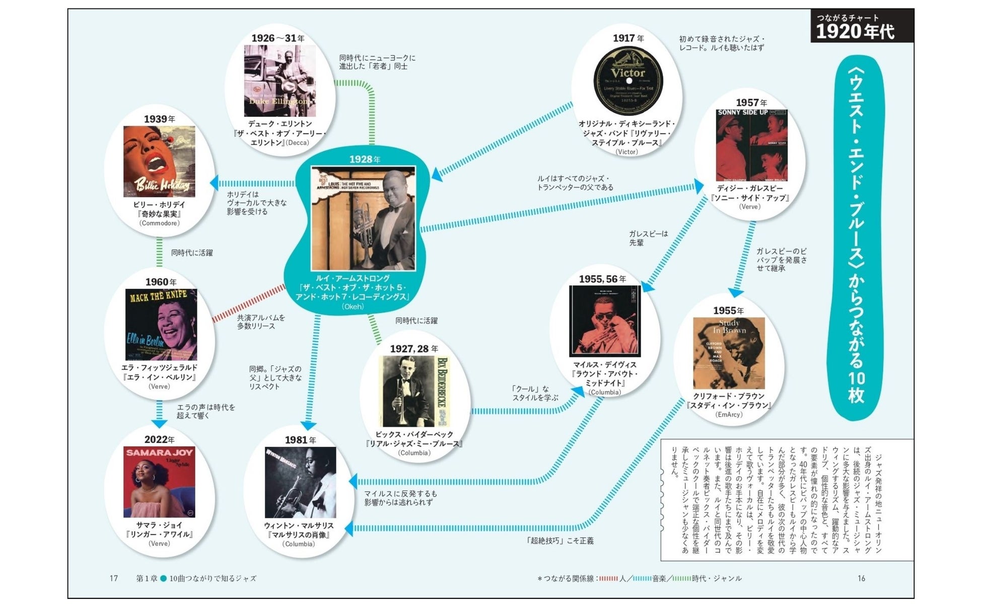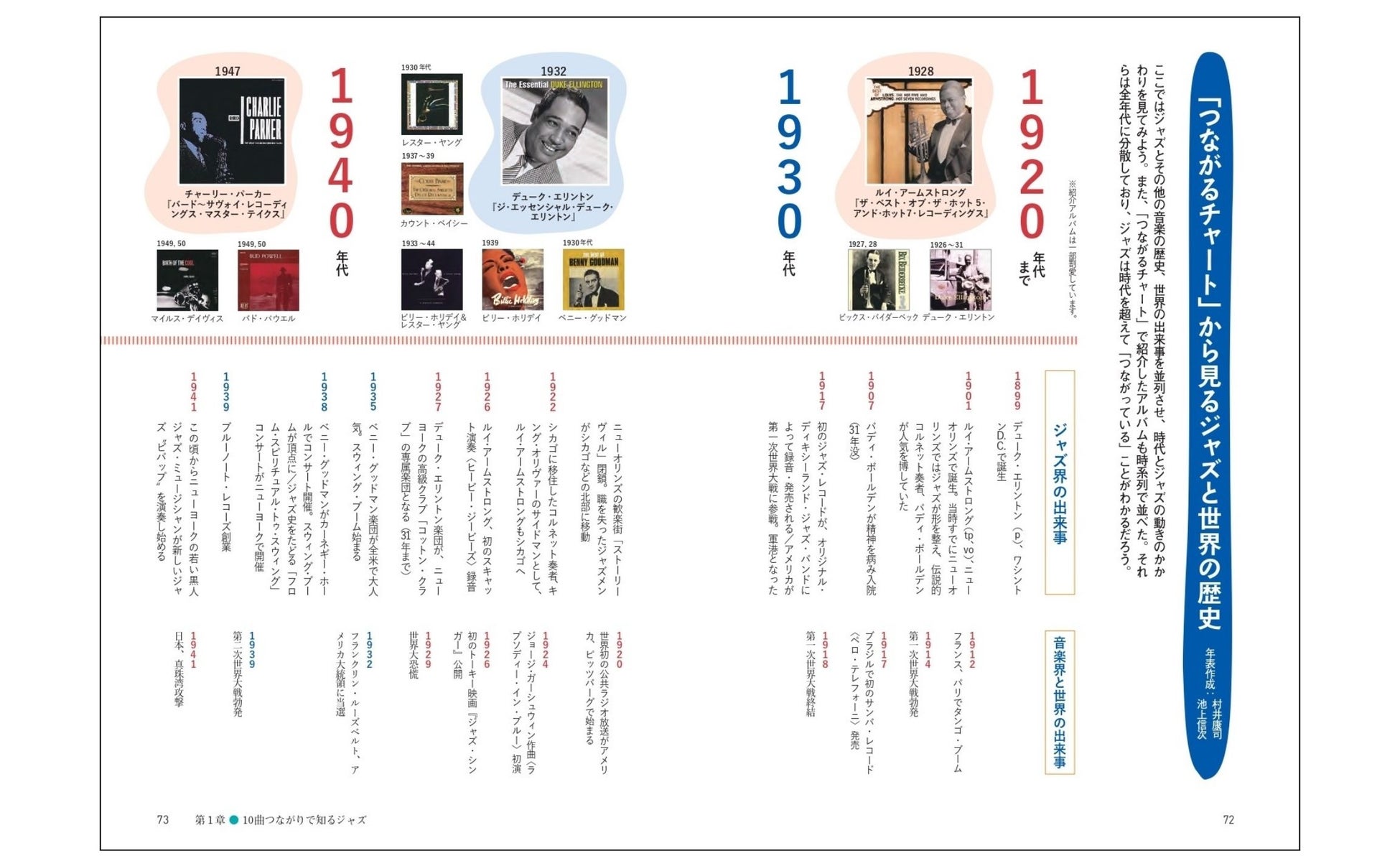 本書第1章では、1920年代から10年ごとに、その時代の代表曲「1曲」から「つながるチャート」を掲載。ビジュアル図解で、変化し躍動するジャズの歴史をひと目で把握できます。「ジャケット年表」「ジャズ・スタイル・マトリックス」、そして帝王マイルス・デイヴィスを通してみたジャズ史観をも提示します。
