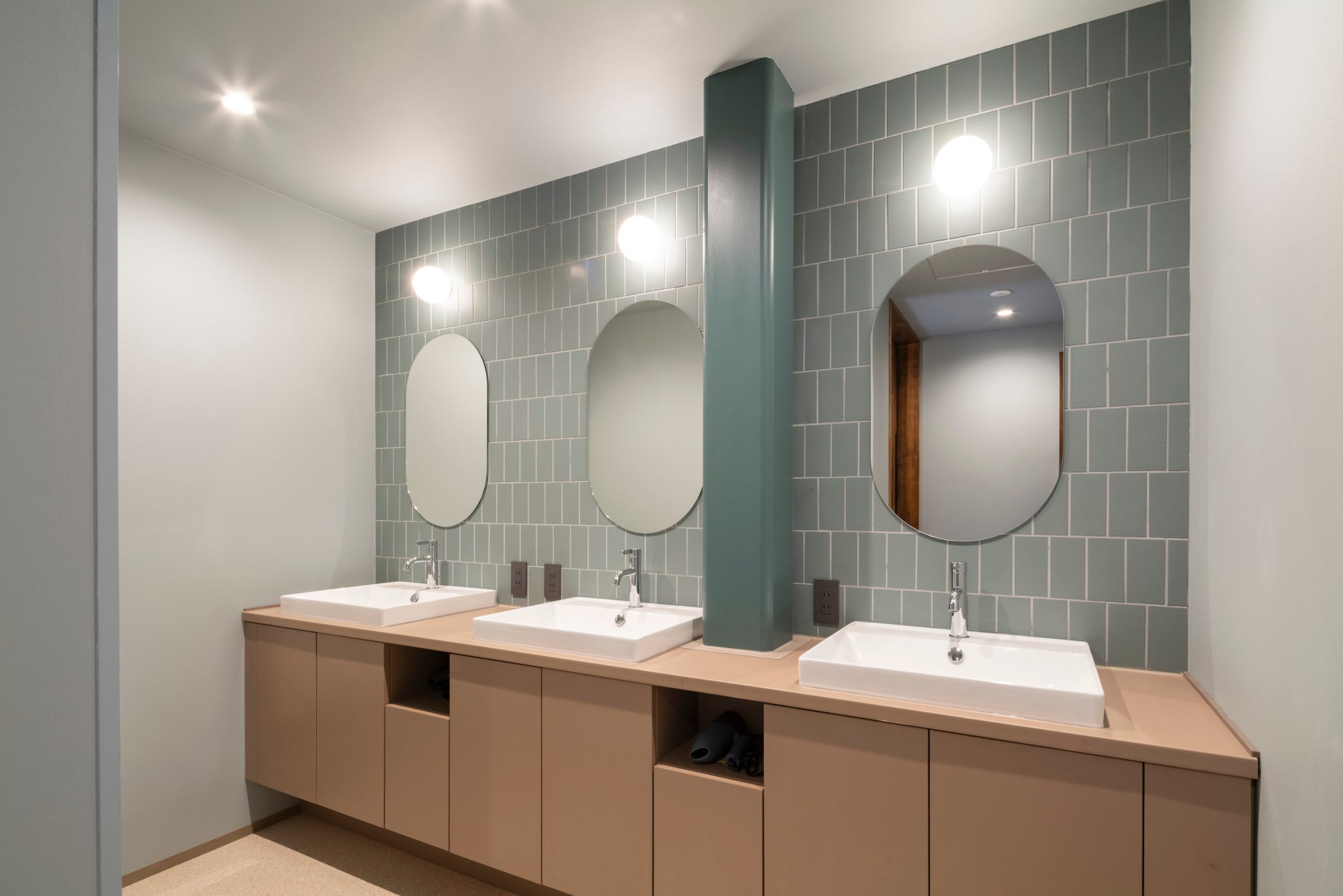 脱衣スペースを含め充分な広さを確保したシャワールームと、大きな鏡とドライヤーを備えたパウダールームを用意。ハイクの準備も万全です。