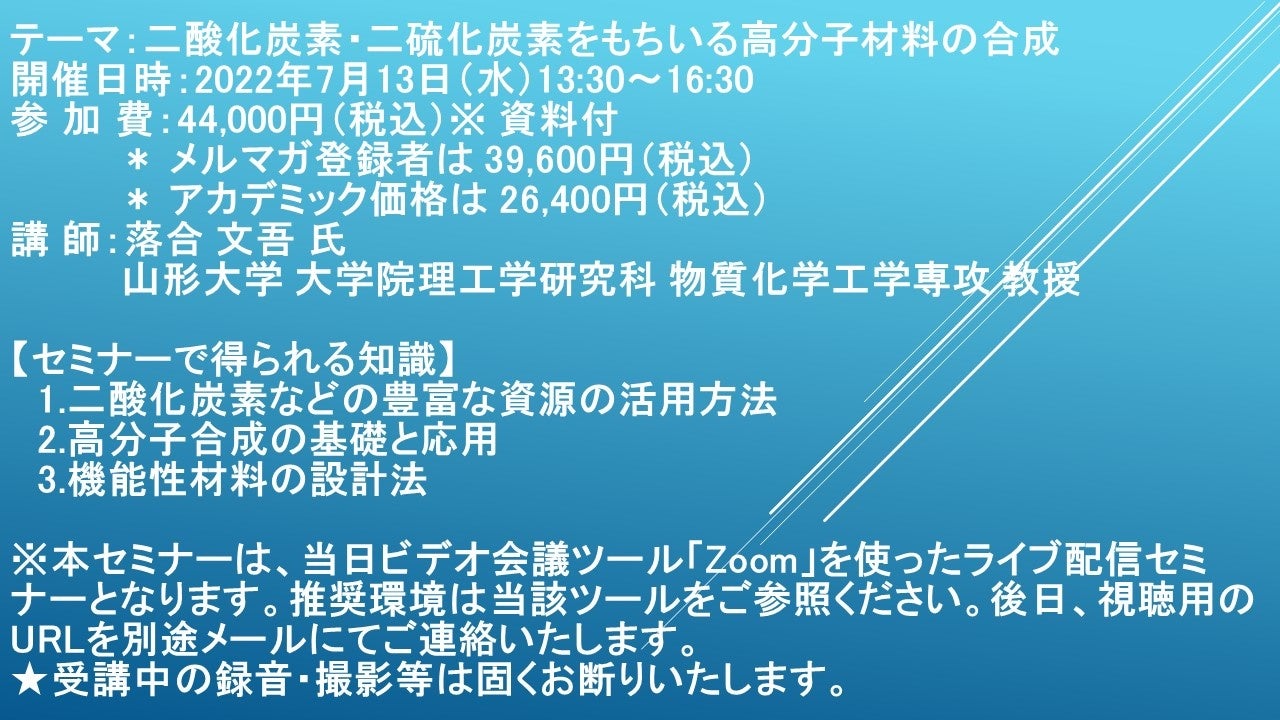 【ライブ配信セミナー】二酸化炭素・二硫化炭素をもちいる高分子材料の合成 7月13日(水)開催 主催:(株)シーエムシー・リサーチ