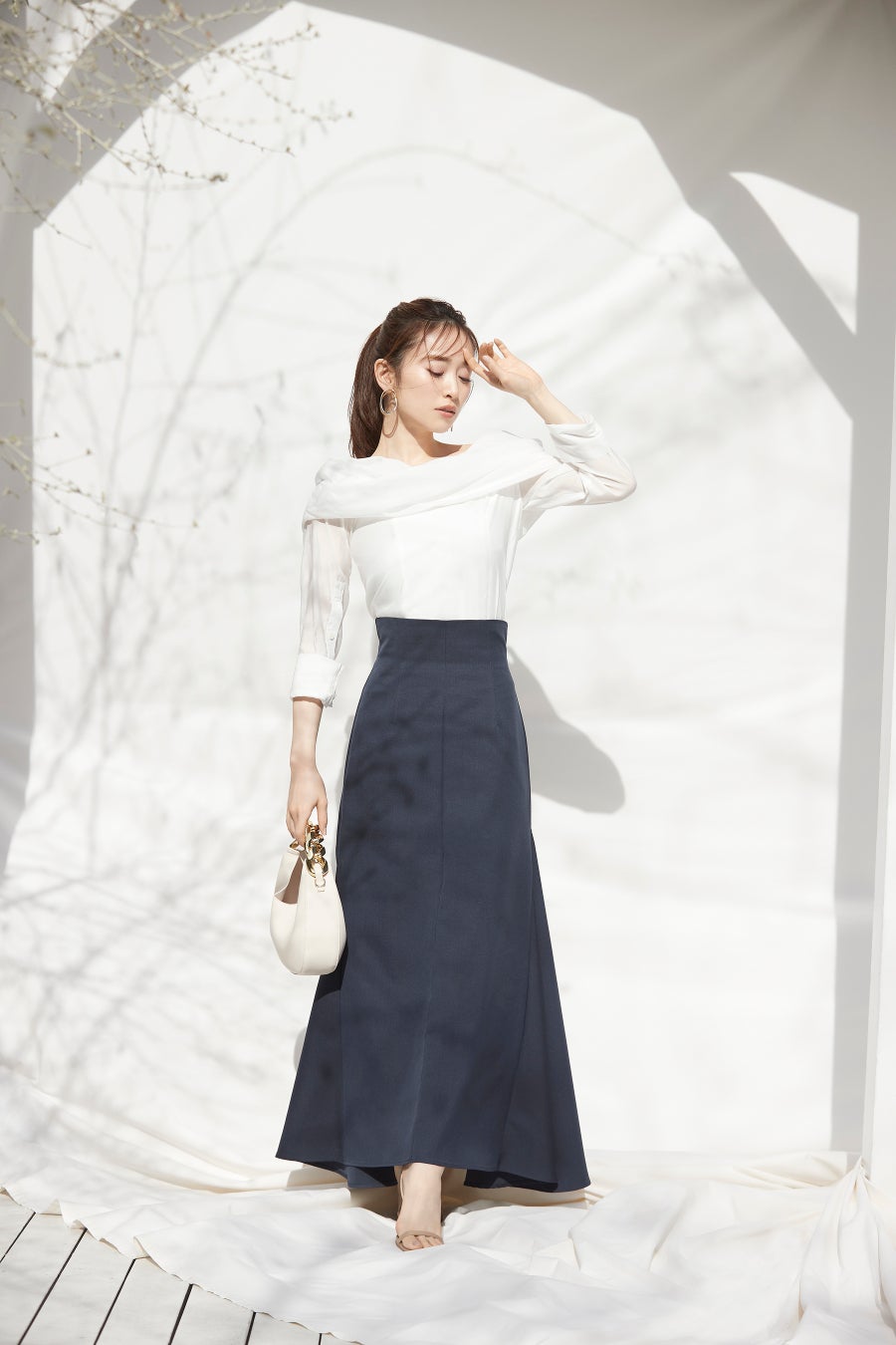 不規則なヘムラインのフィッシュテールディテールが一際存在感を放つ。