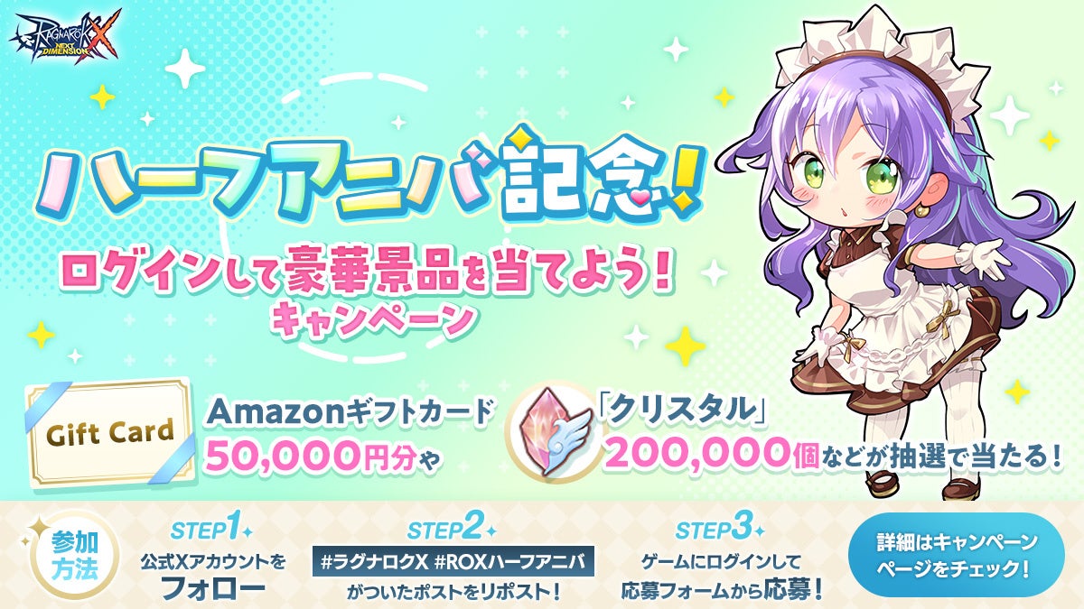 いつも『ラグナロクX』を楽しんでいただいている皆様へ感謝の気持ちを込めて、プレゼントキャンペーンを実施いたします。ご応募いただいた方の中から50,000円分のAmazonギフトカードや、「クリスタル」200,000個などの豪華景品が抽選で当たります。たくさんのご応募をお待ちしております。