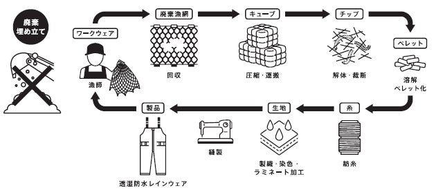 フィッシングタックルをグローバルに展開するDAIWAが「地球を想い、世界中の仲間と豊かな自然を未来へつなぐ」ことを目指し、2022年3月にスタート。本プロジェクトは廃棄漁網を糸へと再生し、ウエア等へアップサイクルするプロジェクトです。漁網は海洋プラスチック問題の原因の一つと言われ、多くの漁業関係者が廃棄に苦慮することに着目し、漁業と消費の現場にダイワ製品として提供する仕組みを構築します。