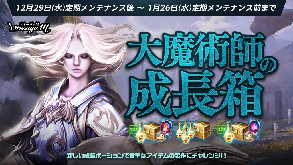 一定時間、複数のバフの付与や各種製作の材料としても使用可能な「大魔術師の成長ポーション」が獲得できる、「大魔術師の成長箱」にて、 毎週追加される期間限定製作の4週目が開始しました。