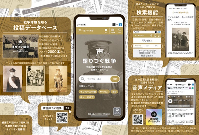 株式会社朝日新聞社(代表取締役社長CEO:角田克)はこのほど、朝日新聞のデジタル版で、読者の戦争体験を伝える投稿データベース「声 語りつぐ戦争」の最新版を公開しました。閲覧できる投稿は約2000本になりました。紙面にはない写真を掲載しているほか、生の証言から戦争の記憶をたどる音声(ポッドキャスト)へのリンクもあります。「空襲」「防空壕」「銃後の暮らし」など、キーワード別の検索もできます。平和学習などにもぜひご活用ください。