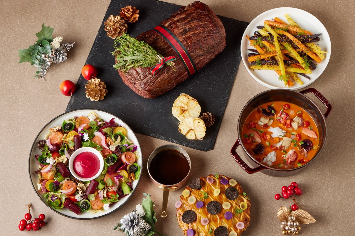 レストランでの食事に加え、家族や恋人、親しい友人たちと共にご自宅で祝うクリスマスは今や定番となりました。ザ・リッツ・カールトン東京では、本年も昨年に引き続き、各種「クリスマス テイクアウトメニュー」をご用意いたします。「名水赤鶏のオーブン焼き ハーブバターと共に」と「根セロリのポタージュスープ」のセットまたは、「国産牛ロースのオーブン焼き」と「マンハッタンスタイル シーフードチャウダー」のセットの2種類からお選びいただき、「三層仕立てのミートパイ 黒トリュフ」、「スモークサーモンとビーツのサラダ キャビア飾り」、「カラフル人参のグラッセ」と共にお愉しみいただけるクリスマス限定の豪華なパーティメニューをご自宅にてご堪能ください。