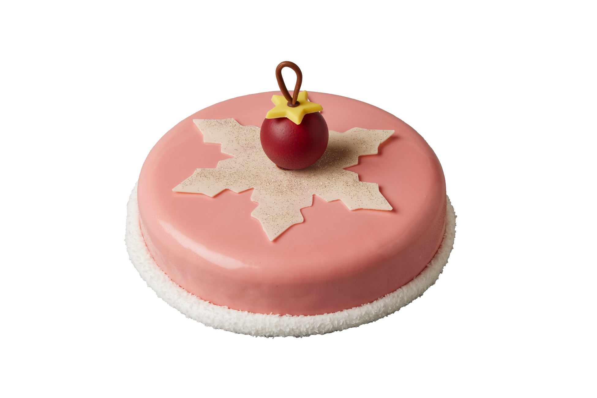 中央にクリスマスオーナメントを模したチョコレート を飾り、ピンク色がホリデーシーズンの気分を盛り上げてくれるムースケーキです。贅沢なライチクリームと繊細なジャスミンムースに、鮮やかなグレープフルーツとラズベリーマーマレードが層を成しており、爽やかで複雑な味わいになっています。